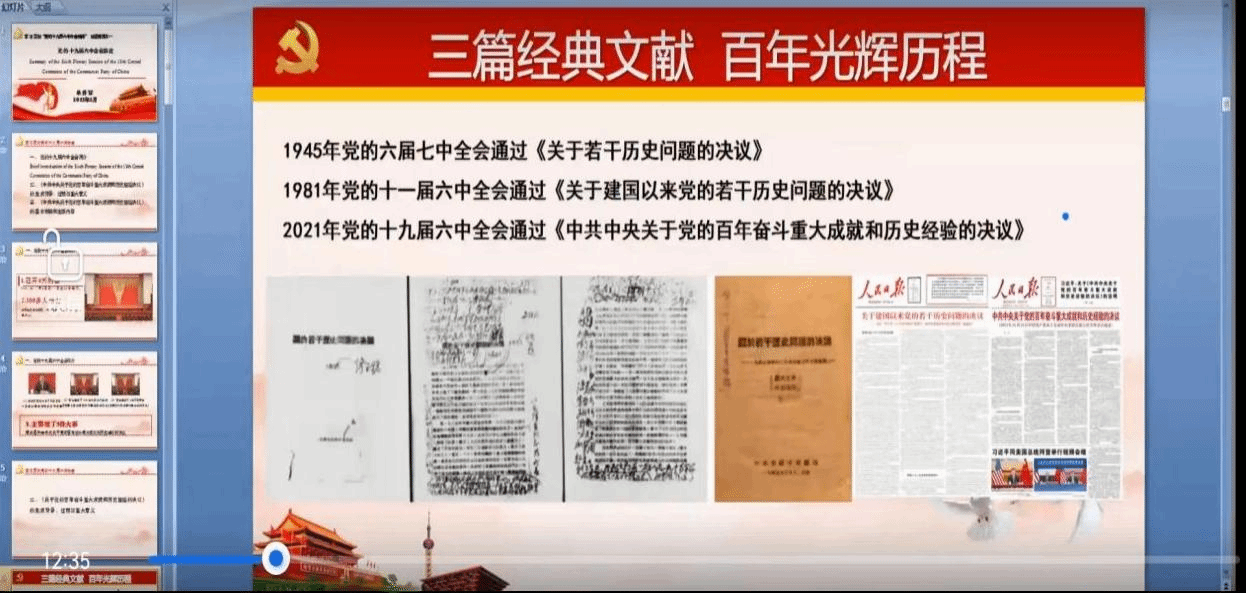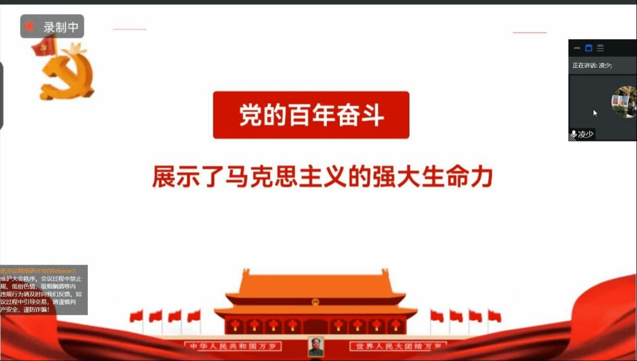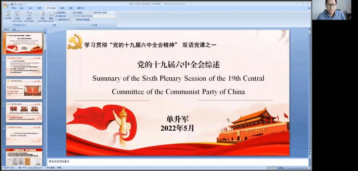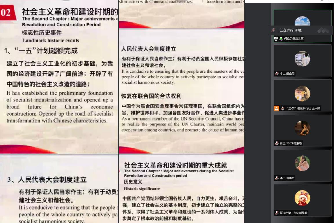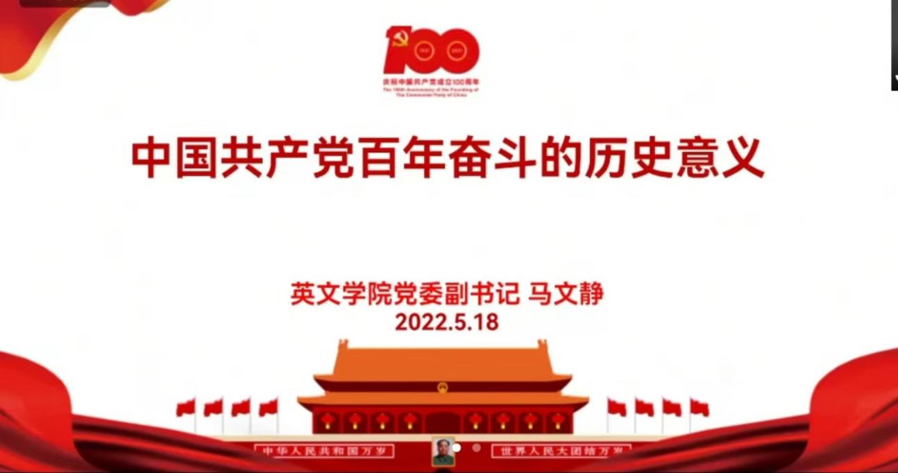 为学习贯彻党的十九届六中全会精神,进一步引导广大学生党员把思想和行动统一到全会精神上来,将学史明理、学史增信、学史崇德、学史力行贯通起来,满怀豪情、斗志昂扬启航新征程、建功新时代。我院党委结合英语专业特色,将时政热点与双语党课相结合,于5月中下旬举办了第五期“学习贯彻党的十九届六中全会精神”中英双语党课。本期党课采用线上教学方式,共分为“党的十九届六中全会综述”“党的百年奋斗重大成就”“党的百年奋斗历史经验”“党的百年奋斗历史意义和新时代中国共产党”四讲,每场均有300名余名学生党员参加。