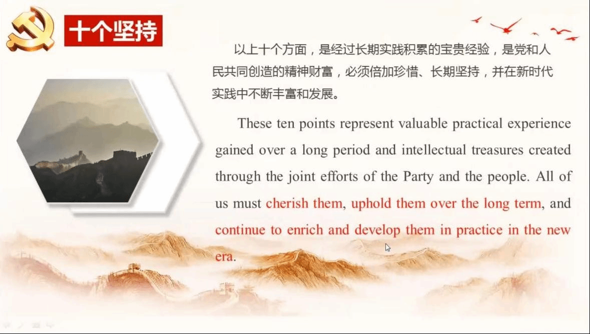 本期双语党课理论扎实,内容丰富,案例生动,进一步加深了同学们对党的十九届六中全会精神的理解,进一步强化了同学们坚定听党话、跟党走的理想信念,进一步提高了同学们的思想政治觉悟和英语专业素养。专题讲解“党的十九届六中全会精神”,将党的百年历史奋斗历程中历久弥新的精神和专业学习相融合,是学院统筹推进党员党性教育和专业教育的重要举措,对于培养社会主义建设者和接班人有着深远意义。