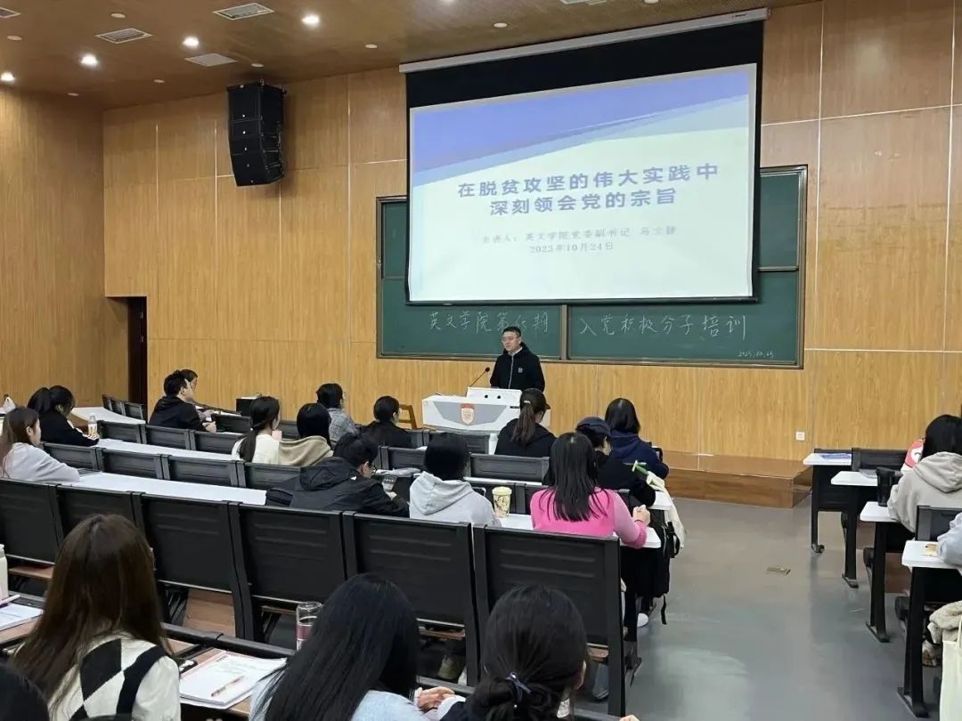 本次培训第一讲由我院党委书记单升军以及党委副书记马文静主讲。单升军老师讲述了中国共产党的性质,他指出,党性是指一个政党固有的本质特性,也是政党的生命所系、力量所在。中国共产党是中国工人阶级的先锋队,同时是中国人民和中华民族的先锋队,是中国特色社会主义事业的领导核心。党的最高理想和最终目标是实现共产主义。他以杰出党员校友为例号召青年大学生要坚定理想信念、树立远大目标、练就过硬本领、锤炼高尚品德,把青春之花绽放在祖国和人民最需要的地方。马文静老师则以《在脱贫攻坚的伟大实践中深刻领会党的宗旨》为主题,简述了“中国共产党的宗旨”、“党的宗旨在脱贫攻坚精神中的体现”、“我们在脱贫攻坚一线践行党的宗旨”、“对我们的启示”四大部分,引导青年要牢记嘱咐、听党话、跟党走,要葆有为民情怀,要坚定四个自信,要勇于担当时代重任。