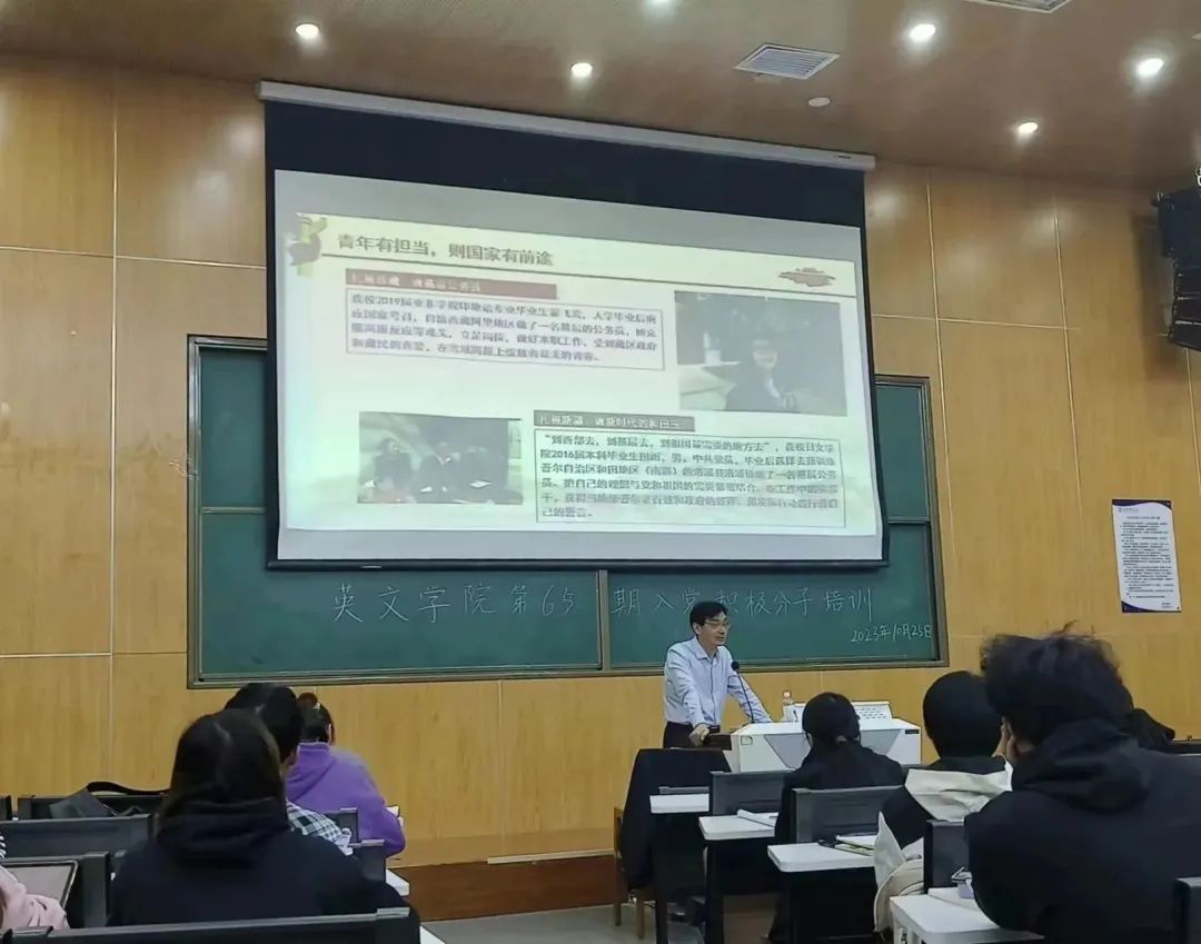 第二讲由校党委委员、统战部部长郑锐华以及我院党务秘书王子涵主讲。郑锐华老师以《做有理想、有本领、有担当的新时代大学生——《习近平的七年知青岁月》对青年人的启示》为主题,向大家讲述了习近平总书记的七年知青生活,总书记在青年时期就树立坚定为人民服务的理想,号召青年要有理想、练就本领、敢于担当,他谈到,青年有理想,国家就有前途,民族就有希望。王子涵老师则以《学习贯彻新<党章>》为主题,帮助学生了解《中国共产党章程》的发展历程,加深提高入党积极分子的政治意识,端正入党态度,号召入党积极分子争做合格党员。