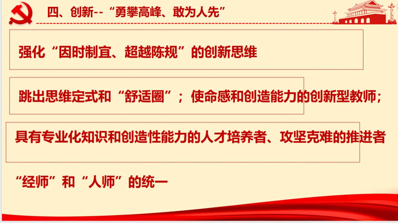 会议第三项,翻译系主任刘晓峰领学了《中国共产党党徽党旗条例》,乔丹雯结合学习内容与自身体会,表达了自己在以后要持续加强理论学习,在各项工作中更加严格要求自己,以组织中的优秀同志为榜样,提高个人工作能力,请组织和同志们帮助并监督的决心。吕允丽、刘晓梅领学了习近平在文化传承发展座谈会上的讲话,张凌将讲话中的关键词、核心理念进行了阐释,表示要深刻理解“两个结合”的理论意义,并鼓励党员教师要发挥先锋模范带头作用,在英语学科发展,高校专业调整的关键时期,面对困难,要主动出击。面对变革,不被动等待,而要做好各种准备,创造时机,在教学实践创新中找好个人努力的方向和赛道,将个人发展与学院的发展、学科发展统一起来,树立为社会的需要、国家的战略目标服务的意识,发挥个人专业优势,在教学科研和人才培养中,担负起新的文化使命,从“小先生”做起,向“大先生”奋斗。