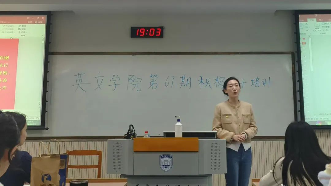 培训第三讲由我院本科生第二党支部书记高洋和马克思主义学院党员教师贾超主讲。高洋老师以《发展党员流程》为主题,从五个阶段详细阐述了发展党员的工作程序,全面详尽地讲解了每个环节的要点,为同学们指明了未来努力和发展的方向。高老师以劳动教育为例鼓励同学们要率先垂范,勇于担当,时刻以党员的高标准严于律己,主动迎接组织的培养与考察,积极投身于党组织的各项任务中。最后,高老师强调入党的意义不在于功利上的所得,而在于思想上的锤炼。她鼓励同学们积极向党组织靠拢,坚定理想信念,争做德才兼备的新时代社会主义建设者和接班人。贾超老师以《从青年毛泽东入党经历看如何端正入党动机》为题,生动讲述了青年毛泽东的成长轨迹和入党心路历程,他强调毛泽东的入党动机是为了救国救民、实现共产主义理想。接着,贾老师剖析了入党动机的重要性,他指出只有树立了正确的入党动机,才能始终保持对党的忠诚和对人民的热爱。最后,贾老师鼓励同学们要勇于担当、敢于创新,认真学习马克思主义理论,锻炼自己的意志品质,努力树立正确的世界观、人生观和价值观。