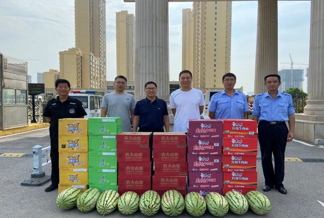 2022年8月9日上午,我院党委书记单升军、大学英语教研室主任徐斌代表学院工会为保卫处假期值班一线职工送上西瓜、矿泉水、饮料、方便面等防暑降温物品,为他们带来关心与问候。