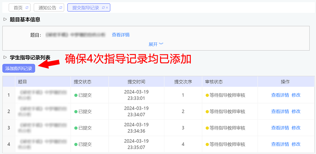 此操作需重复四次,按顺序录入第1、2、3、4次的指导记录,内容请与纸质版论文指导记录表保持一致。如无特殊情况,不必“添加附件”,完成后点击“提交”。