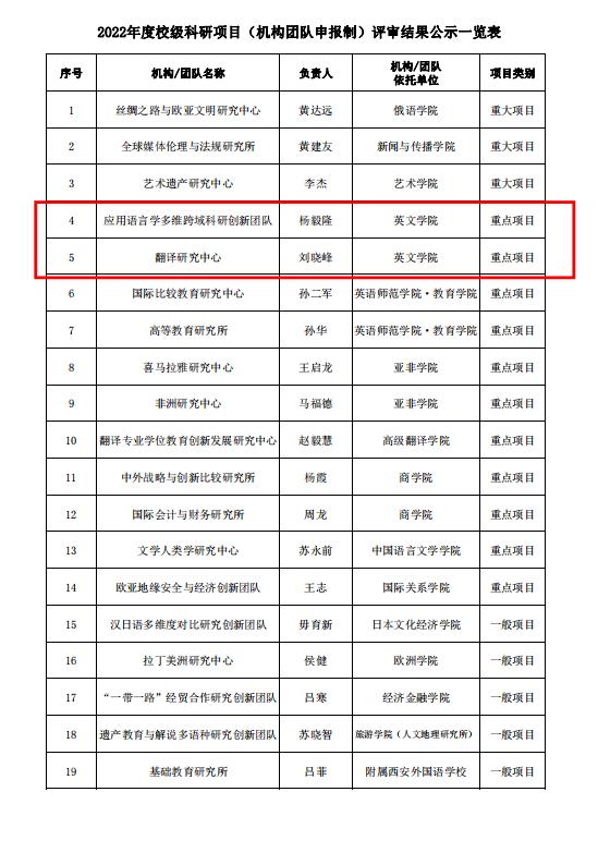 机构团队申报上,杨毅隆博士主持的应用语言学多维跨域科研创新团队获批重点项目,刘晓峰博士主持的翻译研究中心获批重点项目。