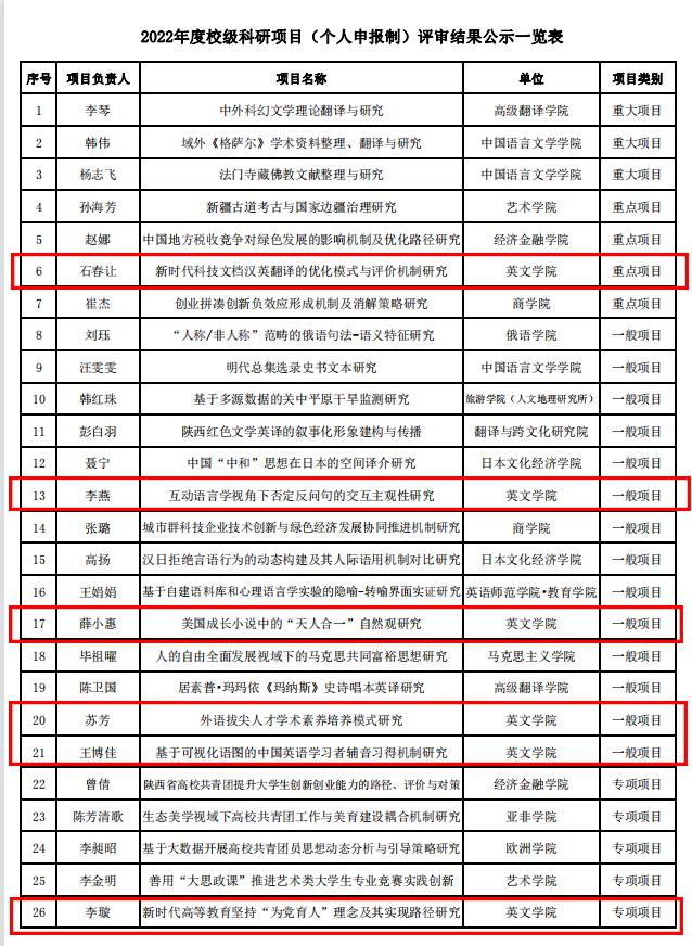 个人申报上,石春让教授主持的“新时代科技文档汉英翻译的优化模式与评价机制研究”获批重点项目;李燕副教授主持的“互动语言学视角下否定反问句的交互主观性研究”获批一般项目;薛小惠教授主持的“美国成长小说中的“天人合一”自然观研究”获批一般项目;苏芳博士主持的“外语拔尖人才学术素养培养模式研究”获批一般项目;王博佳副教授主持的“基于可视化语图的中国英语学习者辅音习得机制研究”获批一般项目; 李璇老师主持的“新时代高等教育坚持“为党育人”理念及其实现路径研究”获批专项项目。在此,对获准立项的老师们表示祝贺。