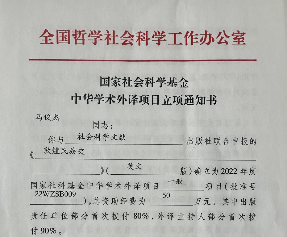 近日,国家社会科学基金中华学术外译项目名单公布,我院马俊杰副教授与社会科学文献出版社联合申报的《敦煌民族史》(英文)荣选为2022年度国家社科基金中华学术外译项目一般项目。
