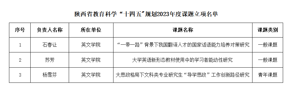 近日,我校科研处公布获2023年度陕西省教育科学“十四五”规划课题立项名单。根据《陕西省教育科学规划领导小组办公室关于做好陕西省教育科学“十四五”规划2023年度课题组织申报工作的通知》,经申报、专家严格评审、课题拟立项公示、省规划办最终审核,我校共有36项课题获批立项。其中我院获批立项一般课题2项,青年课题1项,立项名单如下。