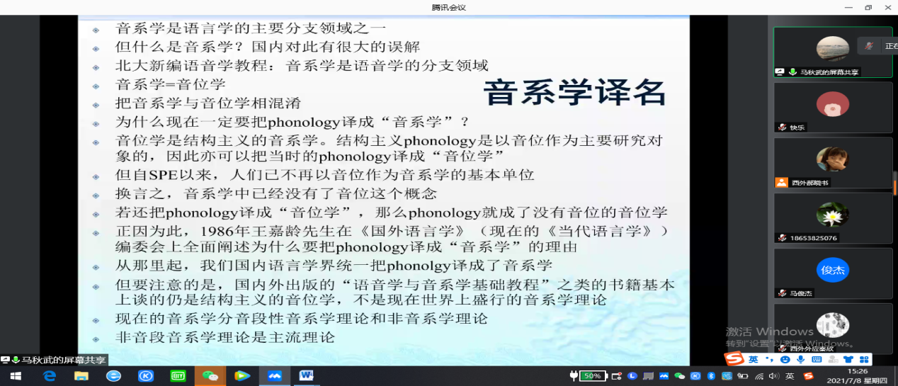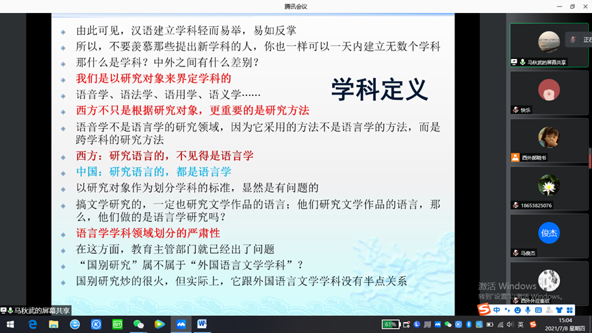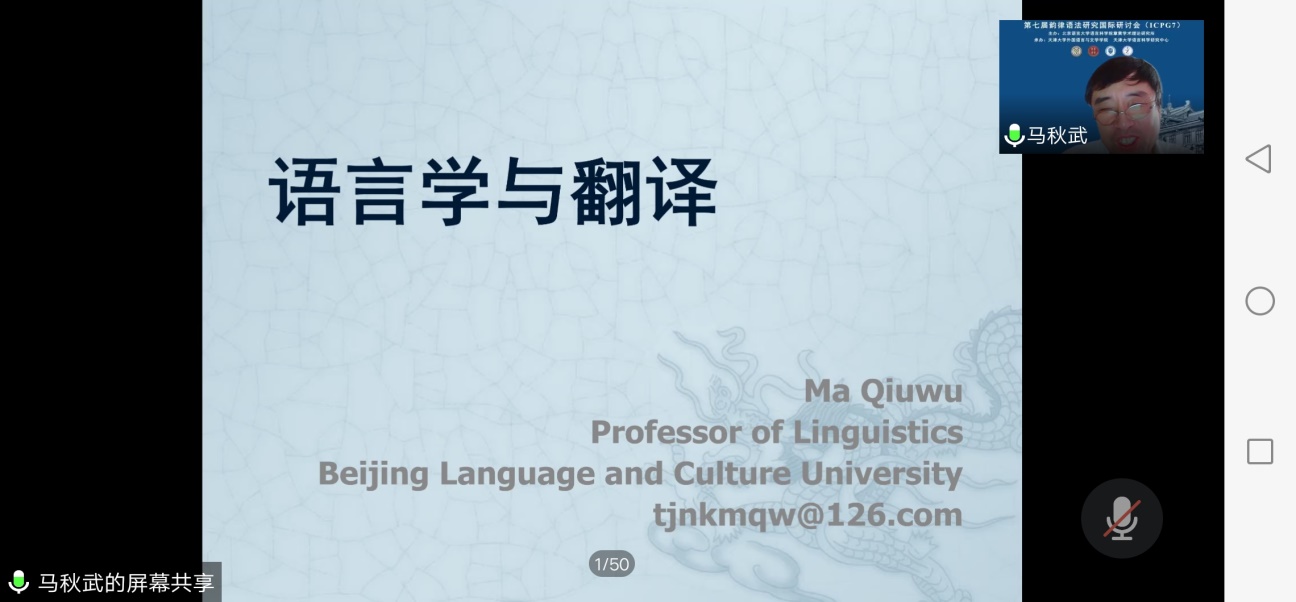 2021年7月8日下午,北京语言大学博士生导师马秋武教授应邀在腾讯会议为我院师生作了题为“语言学与翻译”的讲座。本次讲座由我院副院长赵永刚教授主持,参加此次讲座的主要有点点最新版部分教师,2019级、2020级外国语言学及应用语言学以及翻译学专业的硕士研究生,北京语言大学、中国矿业大学(北京)等高校部分研究人员也聆听了本次讲座。