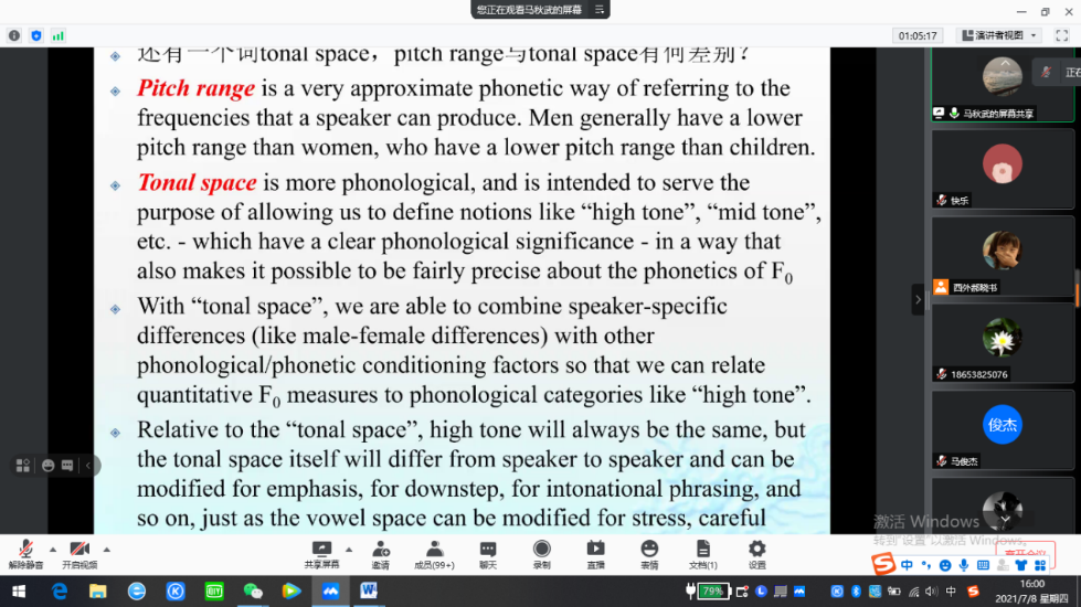 紧接着,马教授从翻译学定义和语言学定义出发,为大家展示与语言学术语有关的翻译现状与存在的问题。关于我国语言学实际翻译实践中存在的一些问题,马教授以“Phonology”如何在中国翻译为例,结合语言学专有名词的翻译实践,如“pitch range、Tonal Space、Lexical Tone”, “Stress & Accent”,以及优选论中“winner & loser”的翻译,详细讲解了语言学与翻译的问题。他指出译者要有专属研究领域,无专业领域的译者往往是做不好翻译的。马教授还补充,语言学专有名词的翻译背后涉及到对于语言学的理解问题,因此,译者在翻译语言学专有名词时,也要对语言学这个领域要有专业和深入的理解。