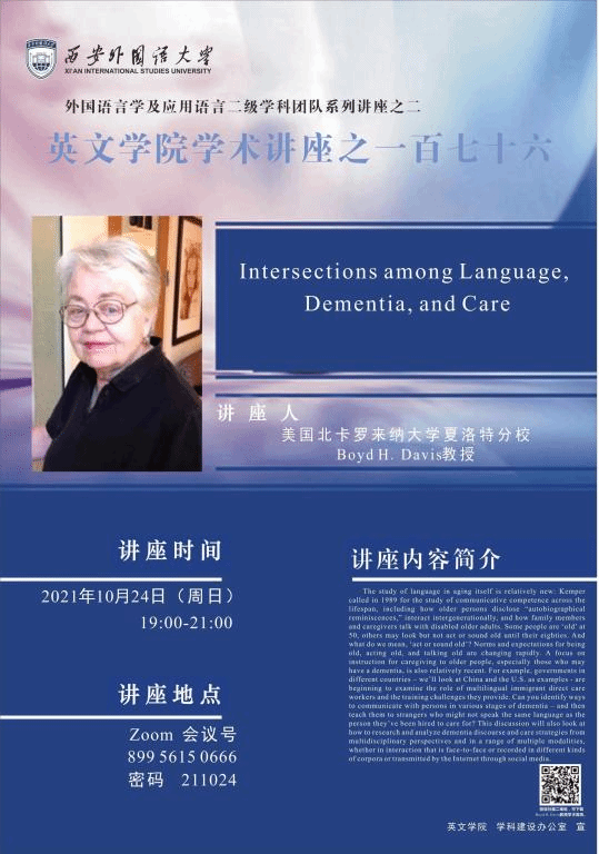 2021年10月24日晚,应我校外国语言学及应用语言学二级学科团队邀请,国际知名语用学与痴呆话语分析专家、美国北卡罗来纳大学夏洛特分校Boyd H. Davis教授通过ZOOM会议,为全国老年语言学研究者作题为Interactions among Language, Dementia, and Care的讲座。该讲座由点点最新版主办,学科办协办,西安外国语大学2018级博士生宋璐同学主持。