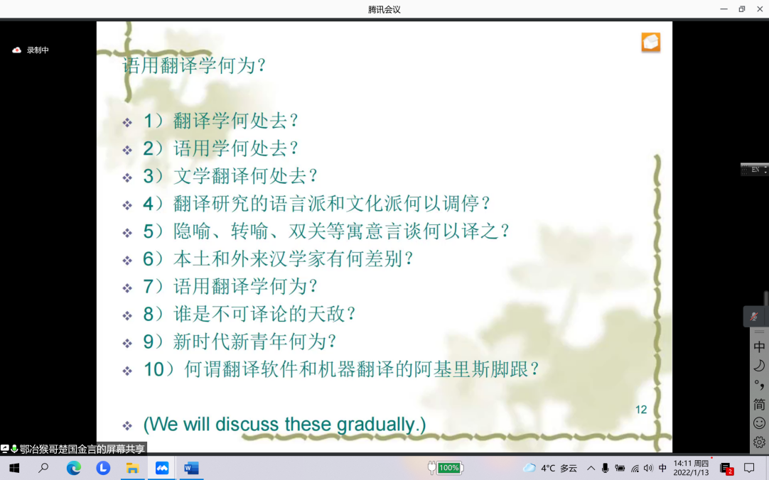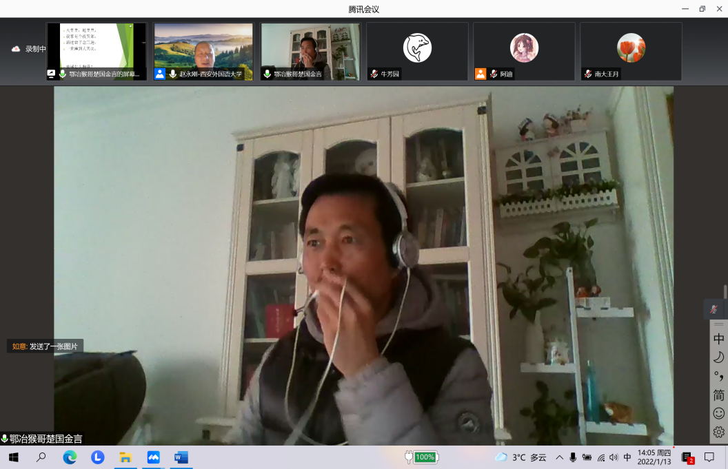 2022年1月13日14:00,华侨大学外国语学院侯国金教授应我院邀请,通过腾讯会议作了题为“语用翻译学何为”的线上学术讲座。本次讲座由我院副院长赵永刚教授主持,我校及复旦大学,华南师范大学,和中国民航大学等高校百余名师生聆听了本次讲座。