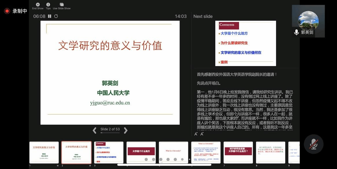 2022年1月14日14:00,中国人民大学郭英剑教授应我院邀请,通过腾讯会议作了题为“文学研究的意义与价值”的线上学术讲座。本次讲座由我校欧美文学研究中心张生庭教授主持,我校及上海外国语大学、南京大学、和人民大学等高校百余名师生聆听了本次讲座。