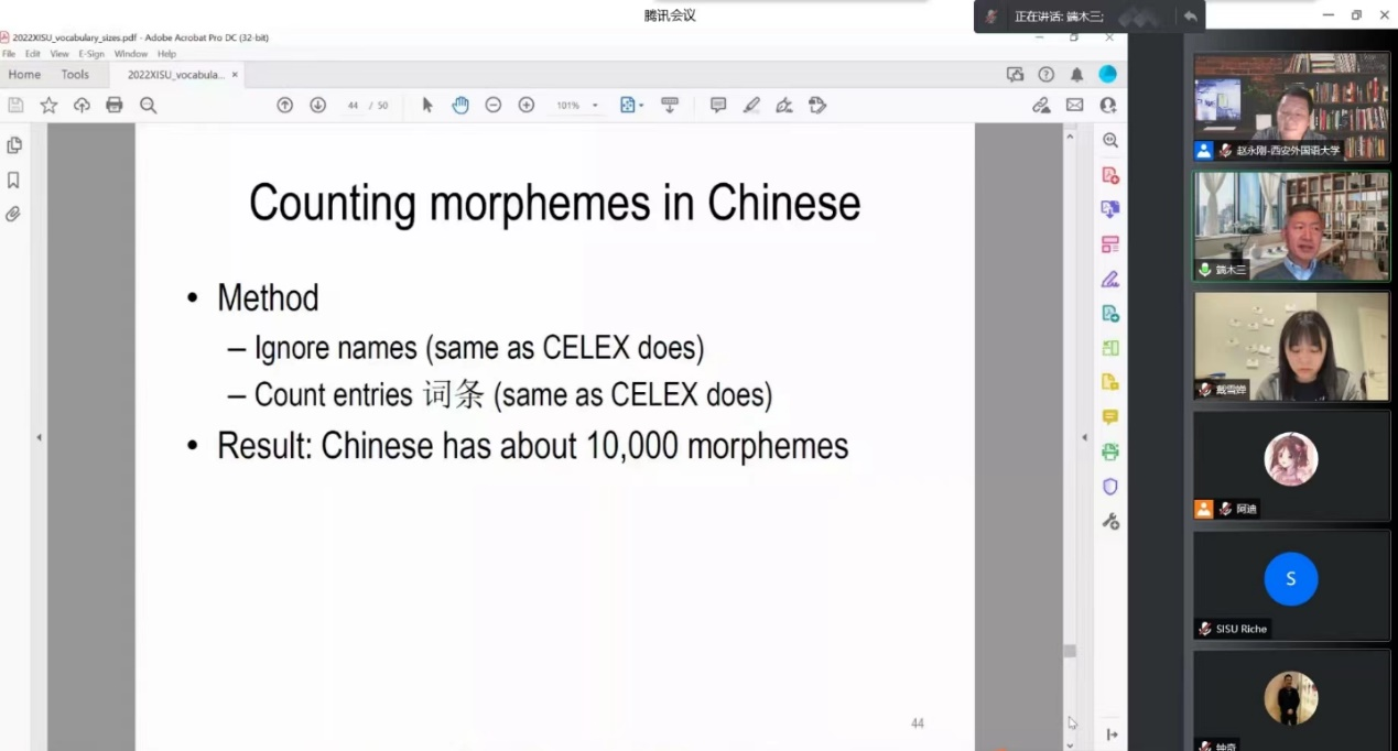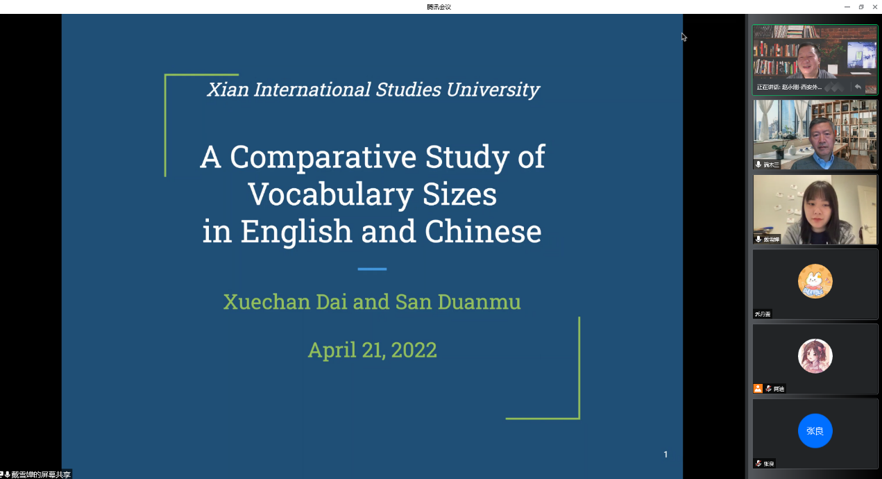 2022年4月21日晚20:00,密歇根大学(University of Michigan)语言学系端木三教授与该校教育学院研究生戴雪婵应我院邀请,通过腾讯会议作题为“A Comparative Study of Vocabulary Sizes in English and Chinese”的线上学术讲座。本次讲座由我院副院长赵永刚教授主持,我校及上海交通大学、天津外国语大学等高校师生聆听了本次讲座。