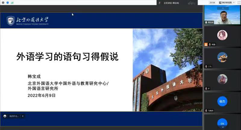 2022年6月9日19:00,北京外国语大学研究生院常务副院长韩宝成教授应我院邀请,通过腾讯会议作题为“外语学习的语句习得假说”的学术讲座。本次讲座由我院马俊杰博士主持,我校及北京外国语大学、上海外国语大学等高校百余名师生聆听了本次讲座。