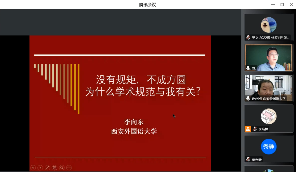 2022年11月10日下午16:00,西安外国语大学高级翻译学院李向东教授应我院邀请,通过腾讯会议作题为“没有规矩,不成方圆:为什么学术规范与我有关?”的线上学术讲座。本次会议由我院副院长赵永刚教授主持,我校及天津外国语大学,哈尔滨工业大学等高校百余名师生聆听了本次讲座。