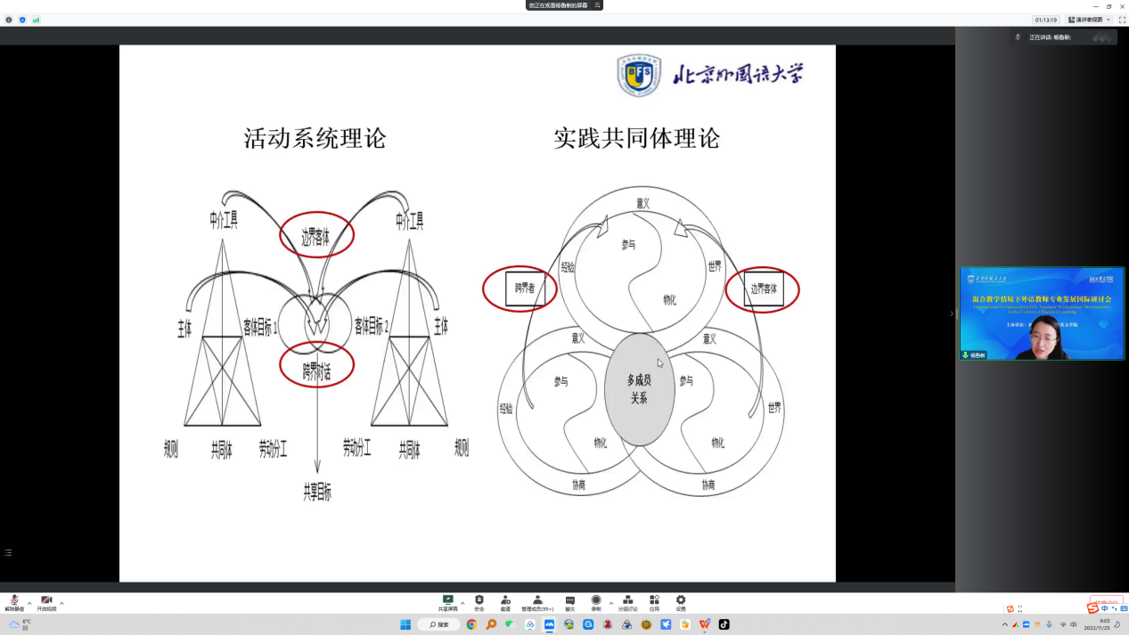 随后,研讨会正式开始。北京外国语大学杨鲁新教授介绍了主题为“跨越边界:高校外语教师多重身份构建”的相关内容。杨教授介绍了活动系统理论和实践共同体理论,任何一个团队的发展都是共同体的建设,在参与的过程中每个人都有自己的解读,都是一个跨界者,会碰撞出思想的火花。跨界的四个机制分别为识别、协调、反思和转化。教师教育者应该走进课堂、走进学生,理论联系实际,以课促思、以研促教、以言促学。