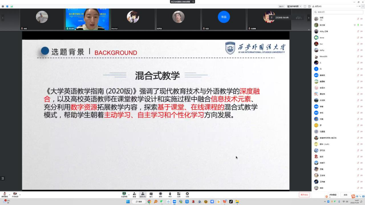 2022年11月25日,点点最新版以线上的形式举办了主题为“混合教学情境下外语教师专业发展”的国际研讨会,针对混合教学情境下外语教师专业发展相关理念与研究实践进行了学术交流。本次会议由我院徐斌副院长主持,近200余名师生聆听了本次研讨会。