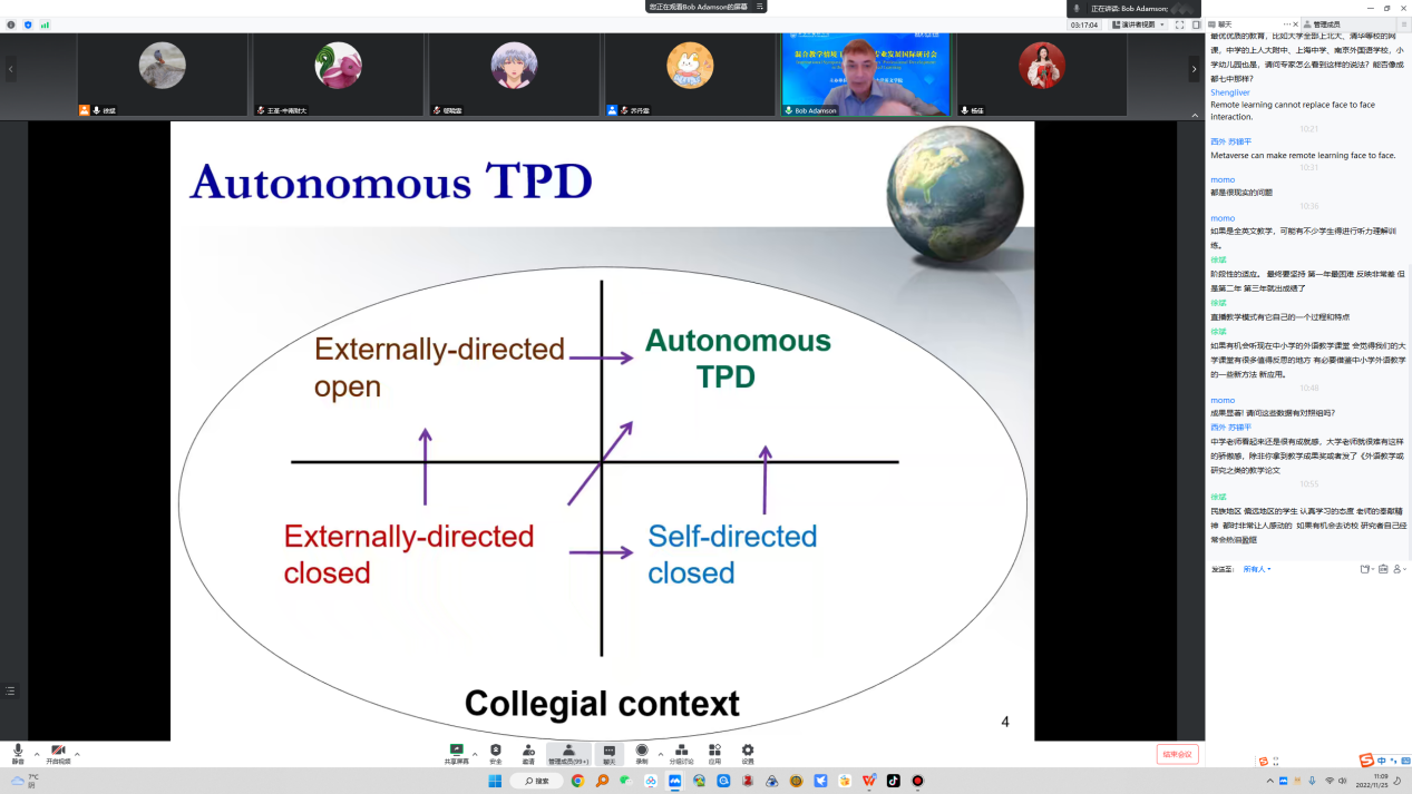 宁波诺丁汉大学鲍勃·亚当森教授以Autonomous Teacher Professional Development in the Context of Blended Learning为题,结合初中英语教师的例子,系统阐释了教师专业发展的趋势、教师专业发展的领域、整体反思和重大事件反思四大方面。