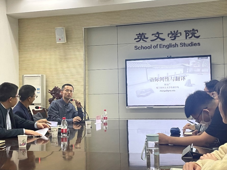 2023年4月26日,美国格兰谷州立大学张先广教授应邀为我院师生作题为“语际间性与翻译”的学术讲座。我院裴等华副院长主持了本次讲座。