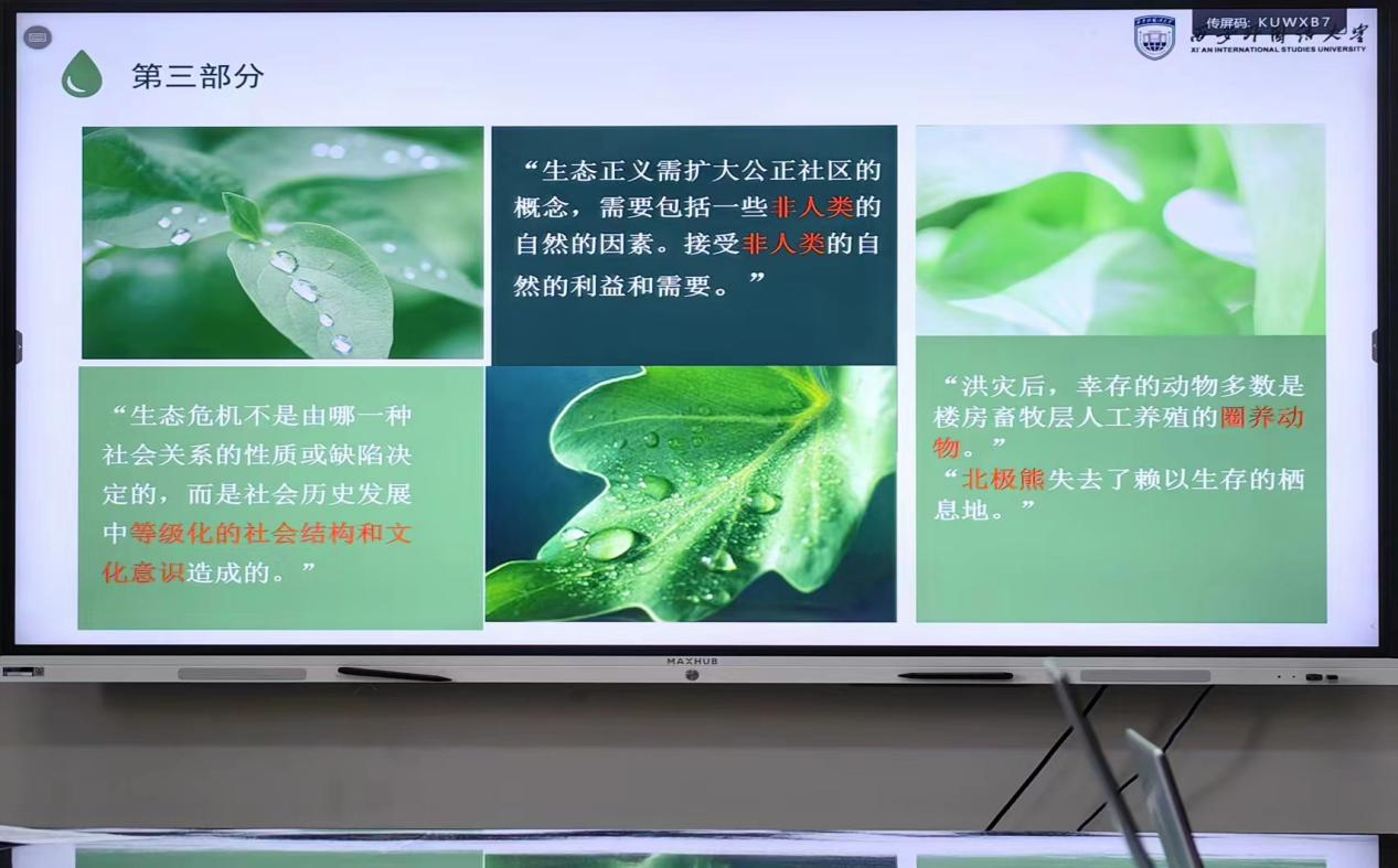 本次讲座内容翔实、逻辑层次分明,激发了同学们对生态议题的更多思考;同时,强化了同学们的理论意识,并有助于开阔同学们的学术视野,大家纷纷表示受益匪浅。