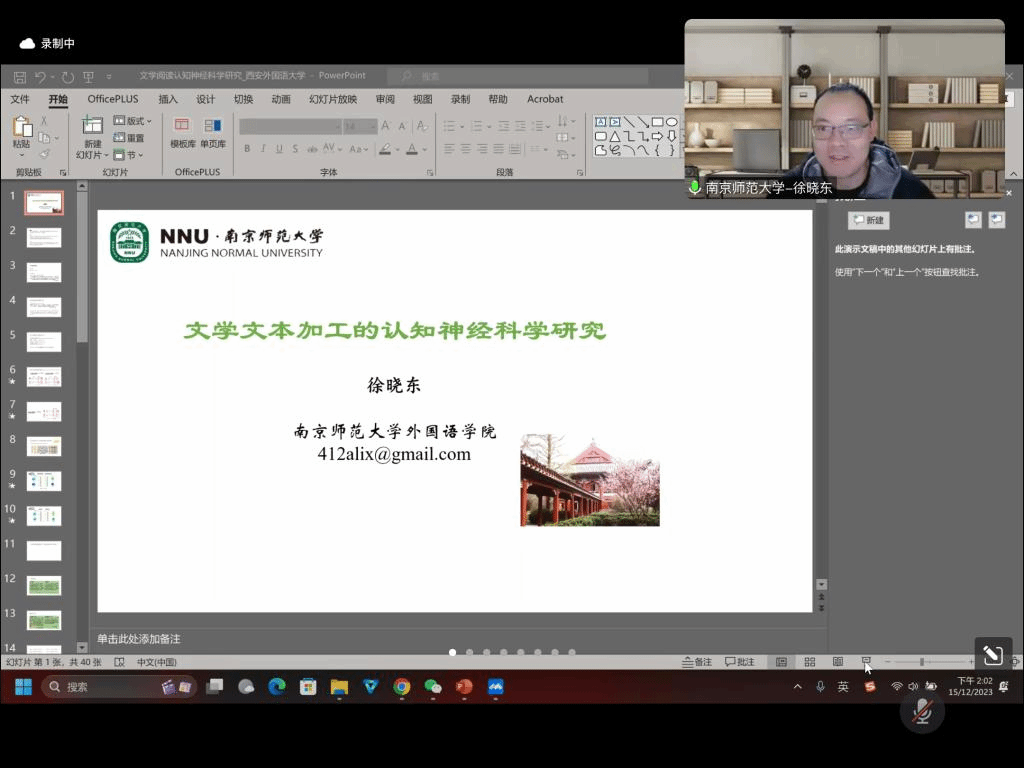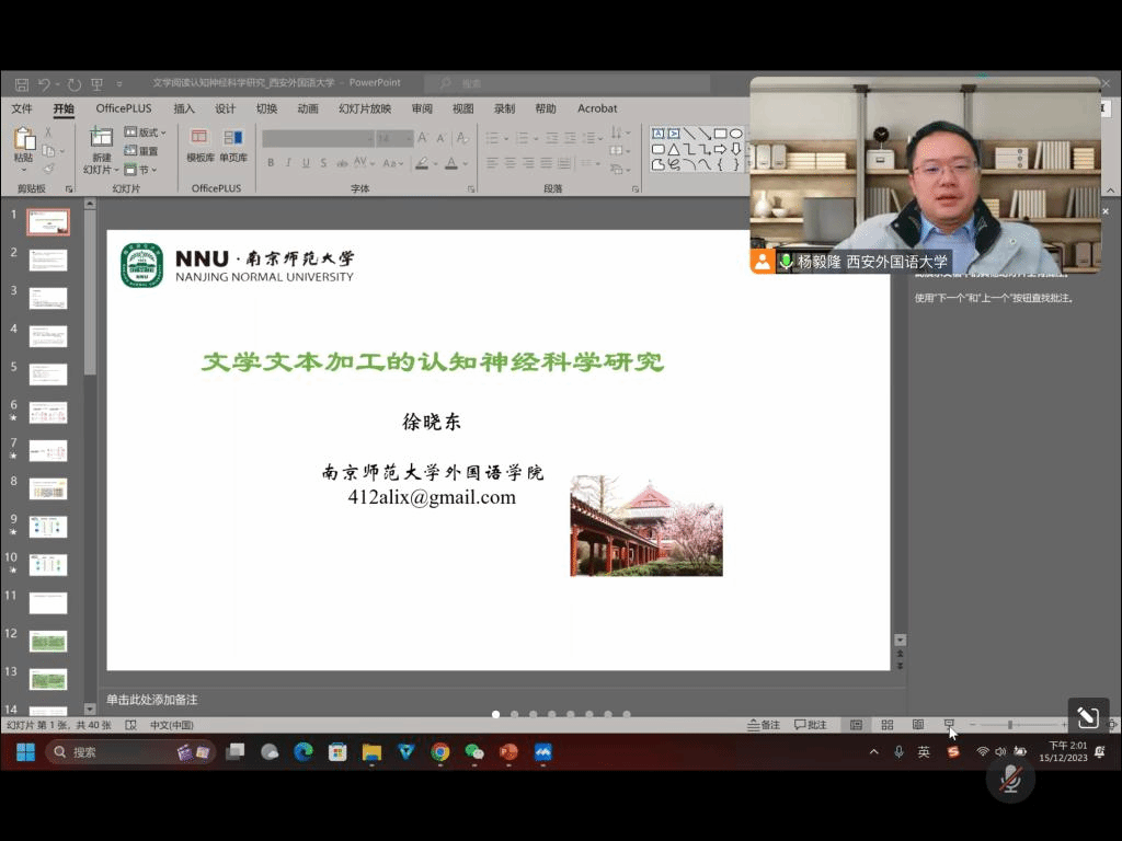 12月15日下午,南京师范大学徐晓东教授为我院师生作题为“文学文本的认知神经科学研究”的线上学术讲座,本次讲座由杨毅隆教授主持,共计100余名师生在线聆听讲座。