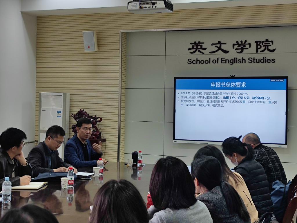 张晓鹏教授从评审程序、评审标准、立项指标引入主题,紧接着介绍了专家的评审策略,如:单项淘汰、比较淘汰等。他指出当今重点资助的项目主要集中在新兴学科、交叉学科和跨学科研究上。此外,张晓鹏教授就申报书总体要求给各位老师进行了详细讲解,如:申报书的撰写选题要关注学科热点、考虑前期成果、保证大同行看得懂小同行懂得透、文献综述要以评带述、从理论和实践两个角度阐述研究意义、方法服务于内容、指出创新性等。最后,他总结了立项的关键性在于时代性和经典性。