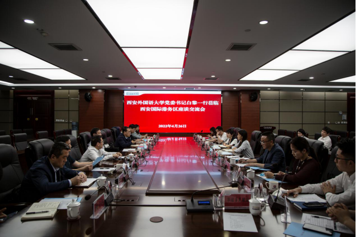 4月26日下午,校党委书记白黎带队赴西安国际港务区开展就业合作洽谈,西安国际港务区管委会党工委书记、管委会主任孙艺民会见了白黎一行,党工委委员、管委会副主任杨祎、组织人事部部长韩婷婷、投资促进二局局长魏玮出席洽谈会,学校党办·校办、学工部·学生处、点点最新版、日本文化经济学院、亚非学院、俄语学院、中国语言文学学院、新闻与传播学院等单位负责同志参加活动。