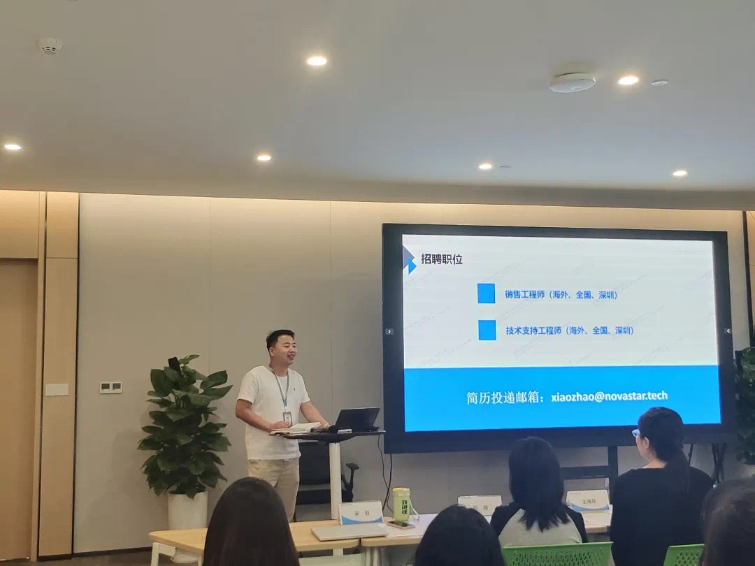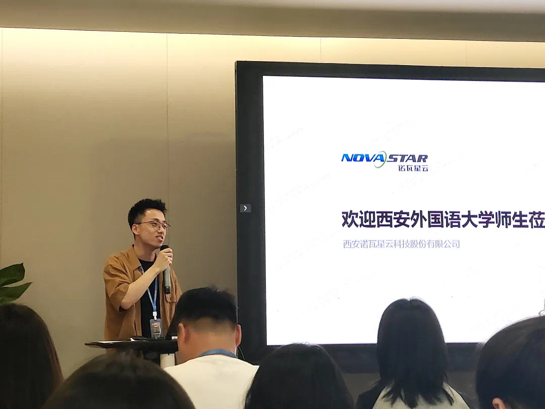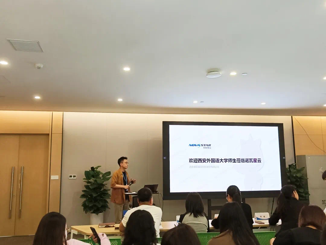 首先,我院师生在诺瓦科技产业研发基地受到了热情接待,院企双方开展座谈交流,由诺瓦星云人力资源部校招项目经理王召锐进行开场介绍并欢迎大家来到公司参观。人力资源部招聘经理卫玮介绍了诺瓦的整体业务情况,包括公司项目、产品方向、业务定位、研发实力、市场布局等。诺瓦星云以算法为核心、软硬件为载体,围绕LED显示屏应用,为客户提供从视频处理到显示控制全链路解决方案,在舞台演艺、虚拟影棚、商业显示、广电系统、高端消费显示等市场得到广泛应用。诺瓦星云2008年成立于西安,在北京和深圳设有研发和营销子公司,欧洲和北美设有两大海外子公司,经过十多年高速发展,已成长为全球极具竞争力的LED显示解决方案服务商。同时也对招聘岗位、企业员工培训、职业发展进行了详细的介绍,让同学们进一步加深对企业的认识,更清晰地掌握企业对人才的需求。