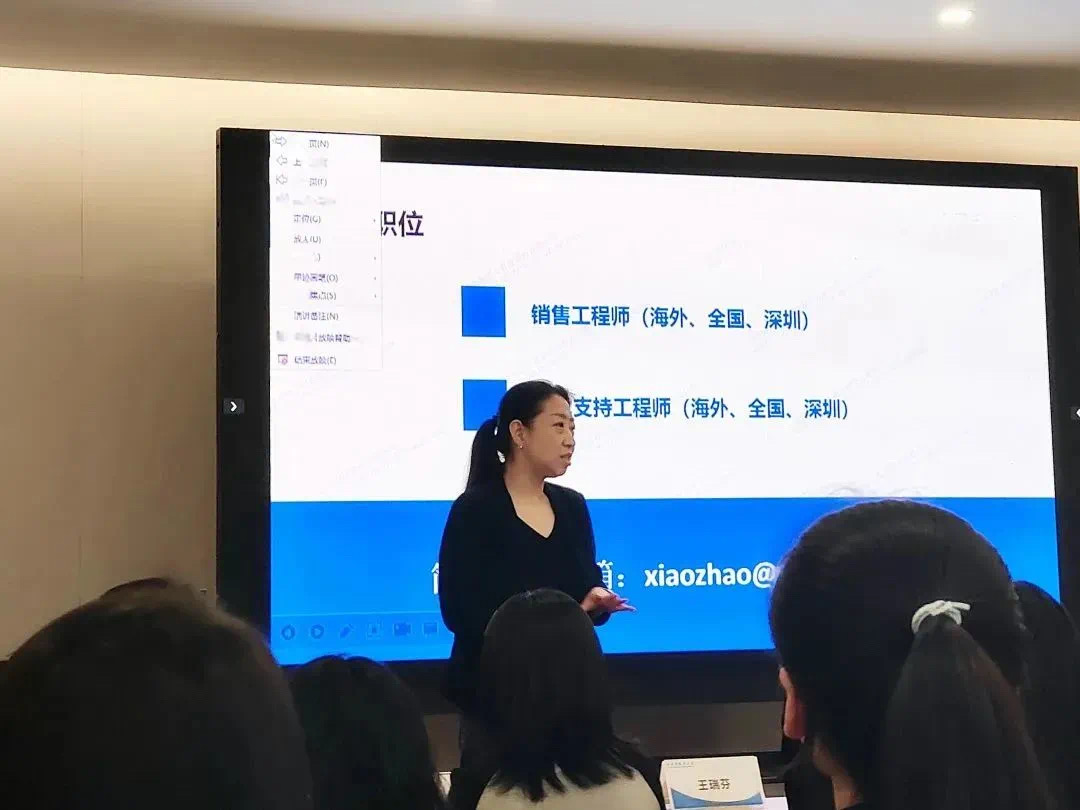 随后,国际部HRBP刘晴介绍了国际部的构成包括面向全球的销售团队、技术服务团队和商务团队,在未来会向全球化布局发展,并欢迎同学们加入国际部。紧接着,我院2015届毕业生,国际部东南亚区中级区域代表宋旺对销售工程师的岗位职责进行了说明,并对有意进入企业的同学们提出建议,一是加强商务英语的学习,掌握基本外贸知识,二是培养良好的心理素质。还为同学们解答了关于工作内容、面试流程等诸多疑惑。