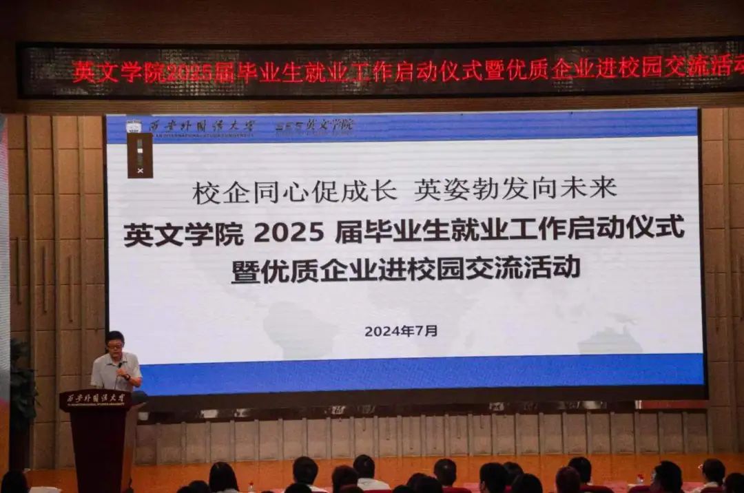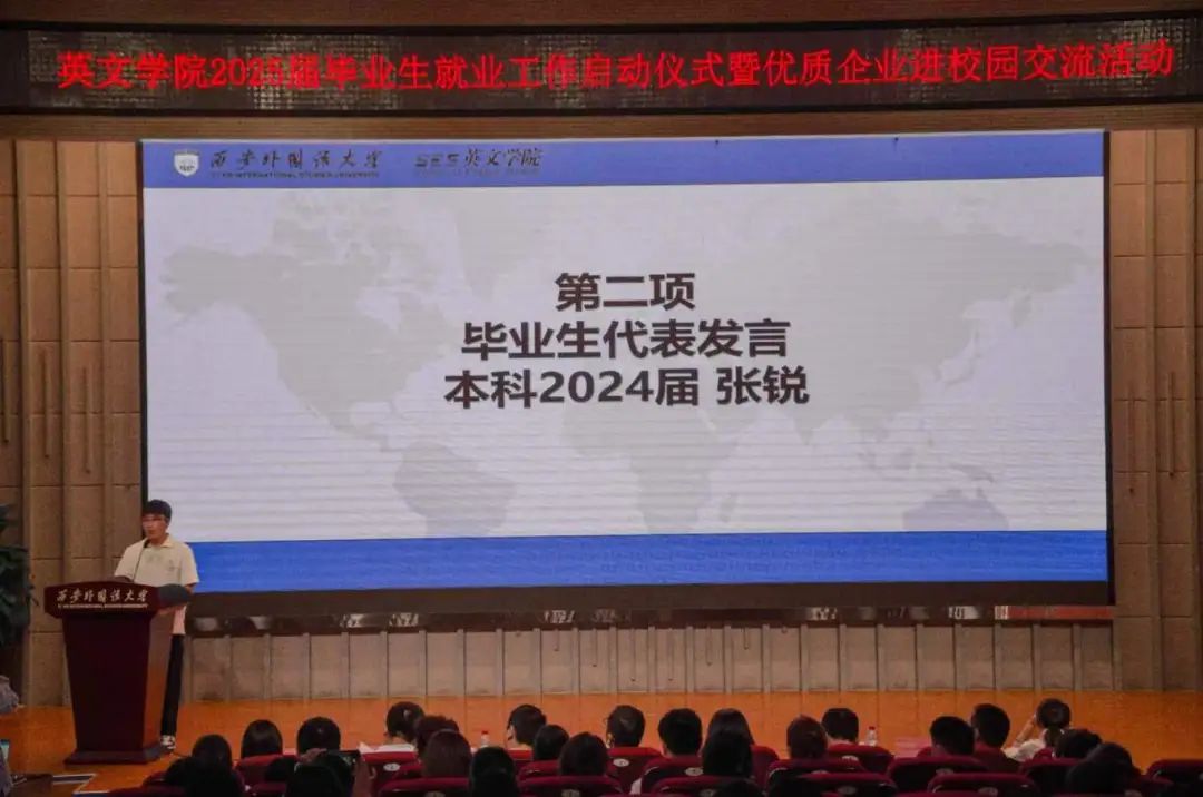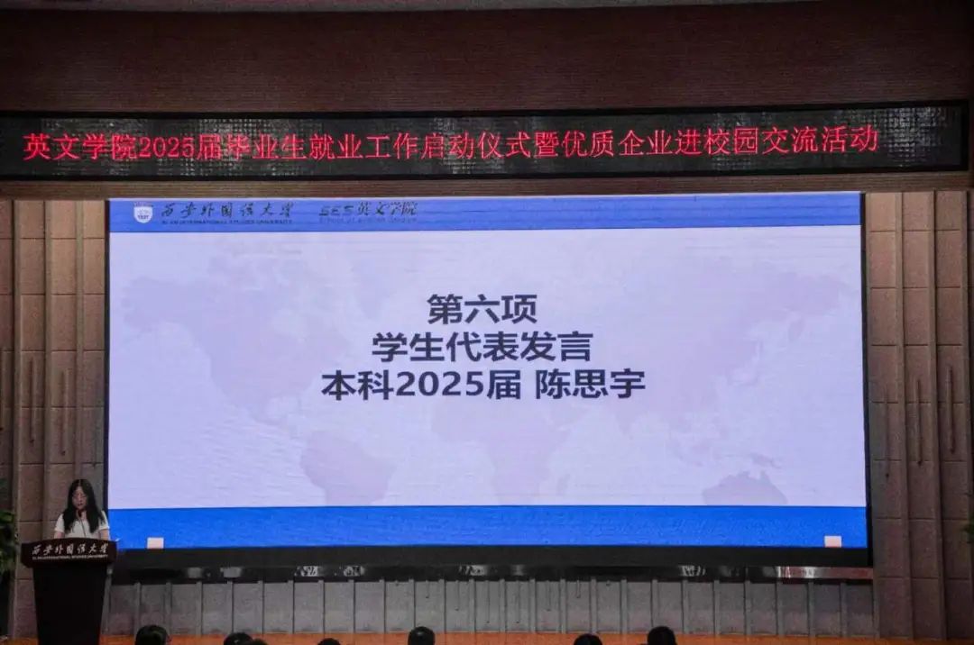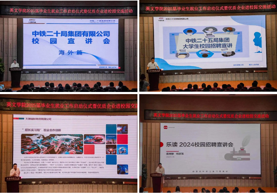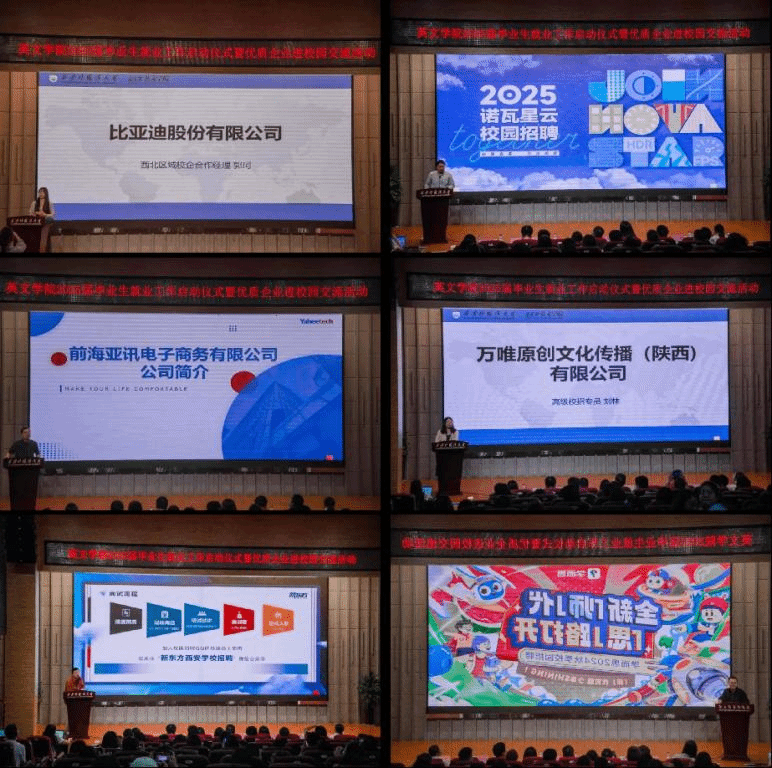 随后,学院向广大2025届毕业生发布此前收集到的百家用人单位信息,帮助毕业生拓宽眼界。受邀现场参会的比亚迪股份有限公司进行了现场分享,上海长宁区乐读线上教育培训学校、西安诺瓦星云科技股份有限公司、深圳前海亚迅电子商务有限公司西安分公司、万唯原创文化传播(陕西)有限公司、西安市新东方培训中心、学而思西安分校、中铁二十局集团有限公司、中铁二十五局集团西北公司、太捷国际物流等9家企业负责人,分别进行了现场企业宣讲,格兰仕电器股份有限公司进行了视频宣讲。