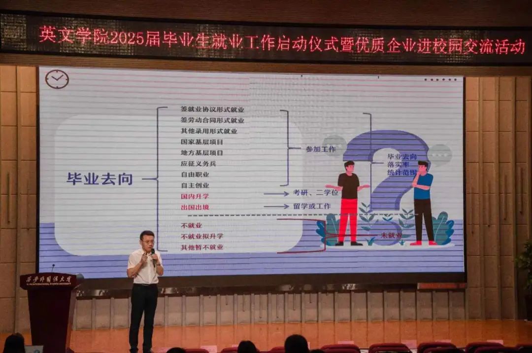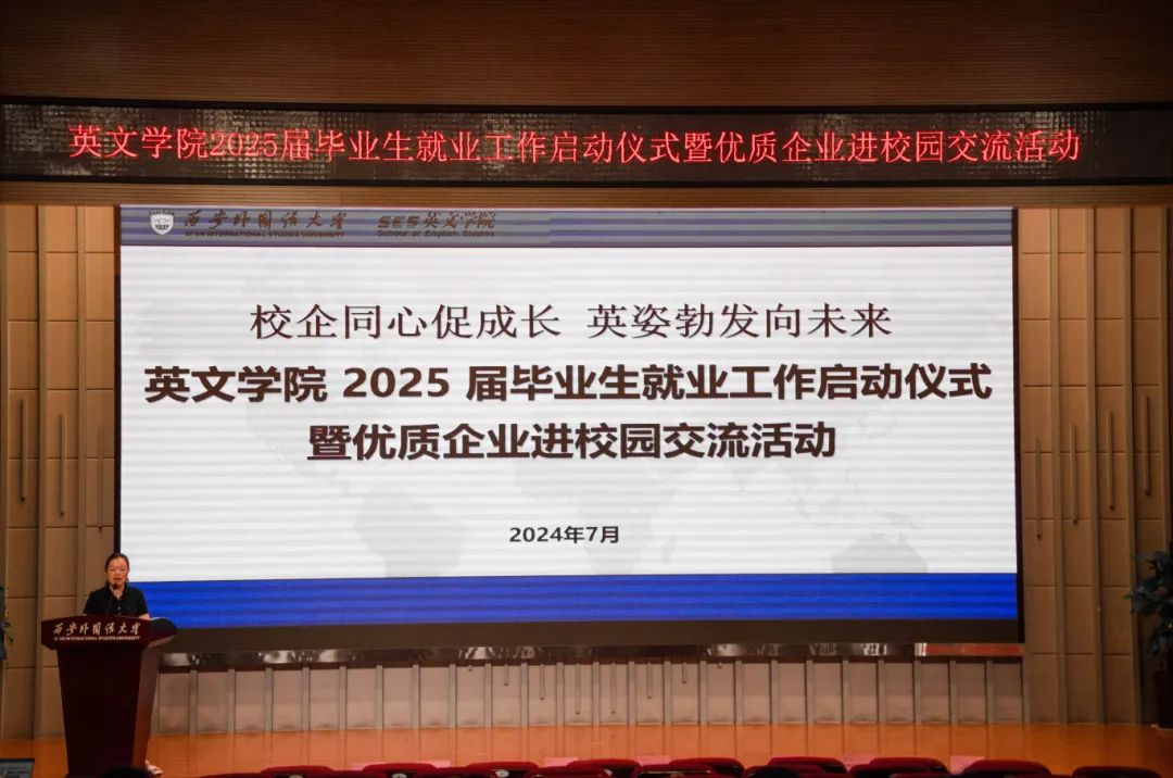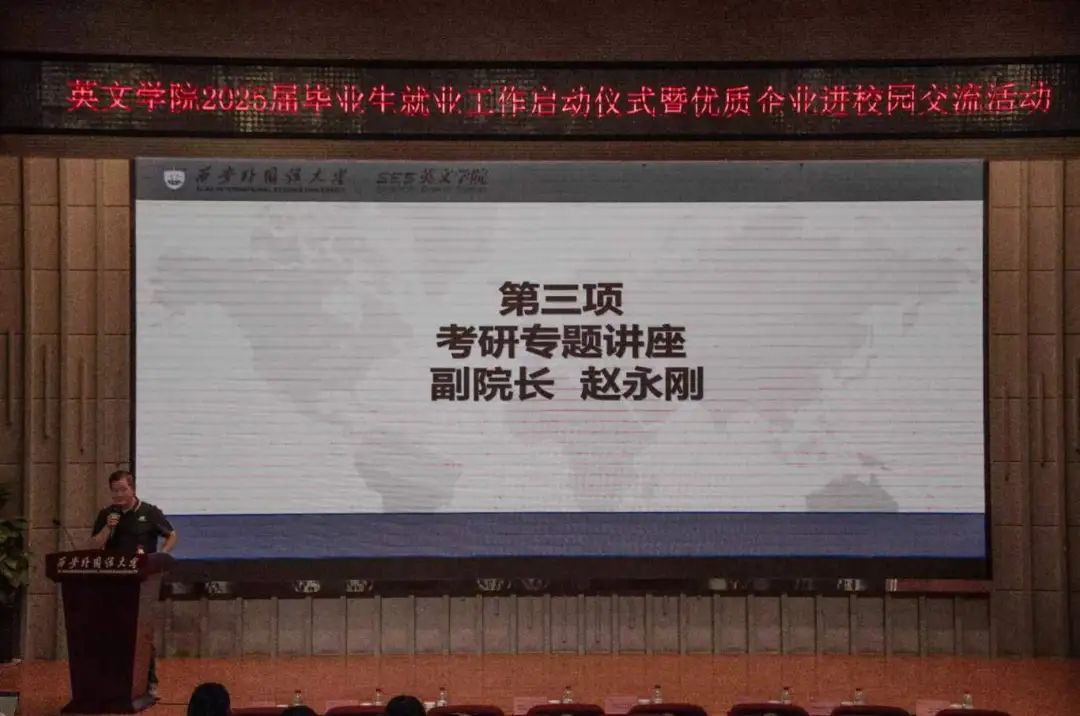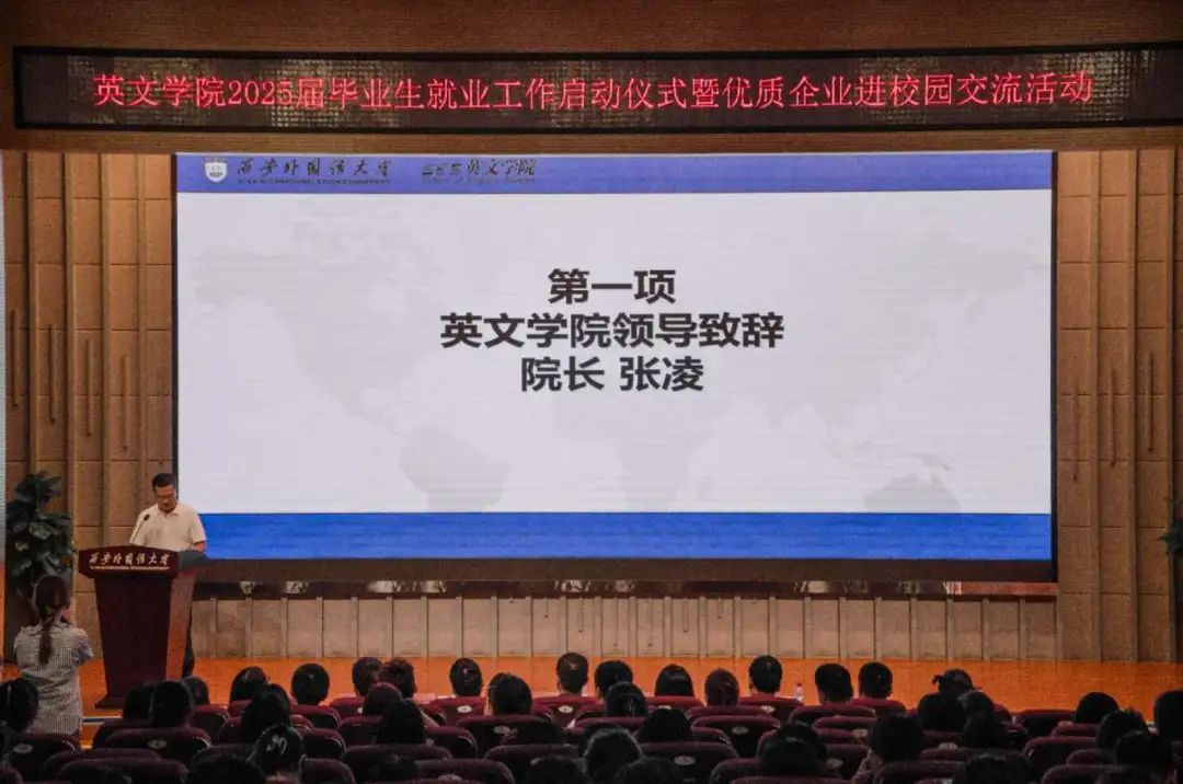 随后,学院向广大2025届毕业生发布此前收集到的百家用人单位信息,帮助毕业生拓宽眼界。受邀现场参会的比亚迪股份有限公司进行了现场分享,上海长宁区乐读线上教育培训学校、西安诺瓦星云科技股份有限公司、深圳前海亚迅电子商务有限公司西安分公司、万唯原创文化传播(陕西)有限公司、西安市新东方培训中心、学而思西安分校、中铁二十局集团有限公司、中铁二十五局集团西北公司、太捷国际物流等9家企业负责人,分别进行了现场企业宣讲,格兰仕电器股份有限公司进行了视频宣讲。