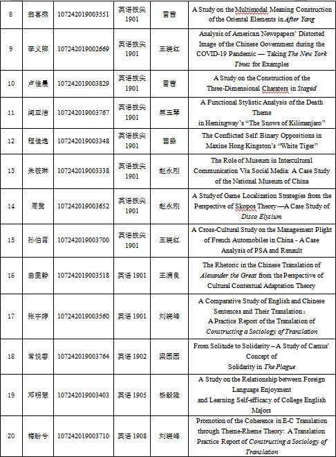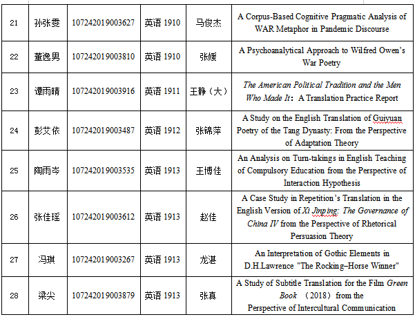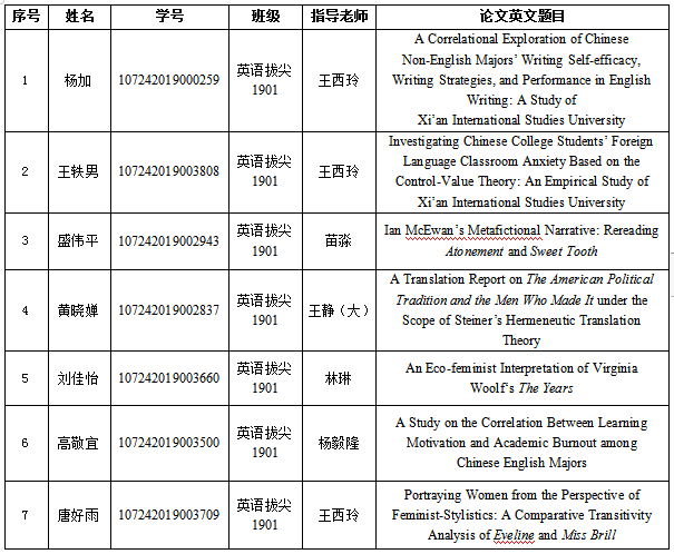 根据学校《关于评选西安外国语大学2023届本科优秀毕业论文(设计)的通知》要求,经本科教学工作委员会研究决定,学院对指导成绩、答辩成绩、总评成绩均为“优秀”且首次检测文字复制比小于10%的30篇候选论文进行了院内专家匿名评审,现拟推荐我院杨加等28名2023届本科生的毕业论文为校级优秀毕业论文。