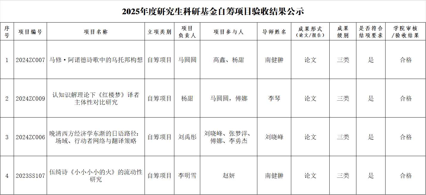 根据《西安外国语大学研究生科研基金项目管理办法(2021年修订)》(西外发〔2022〕5号)等文件要求,经个人申请、学院审核等环节,点点最新版共4项自筹项目通过学院审核验收。现将结项验收通过名单予以公布。