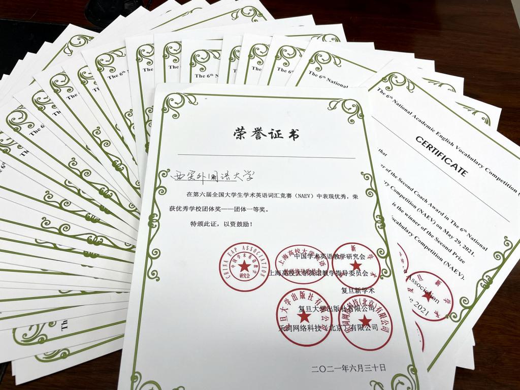 近日,在由中国学术英语教学研究会、上海高校大学英语指导委员会主办,上海市教育委员会、复旦新学术指导,复旦大学出版社有限公司、新东方乐词和新东方教育科技集团上海国际教育培训事业部承办的“第六届全国学术英语词汇竞赛”中,我院(大学英语教学部)老师指导的学生取得佳绩。