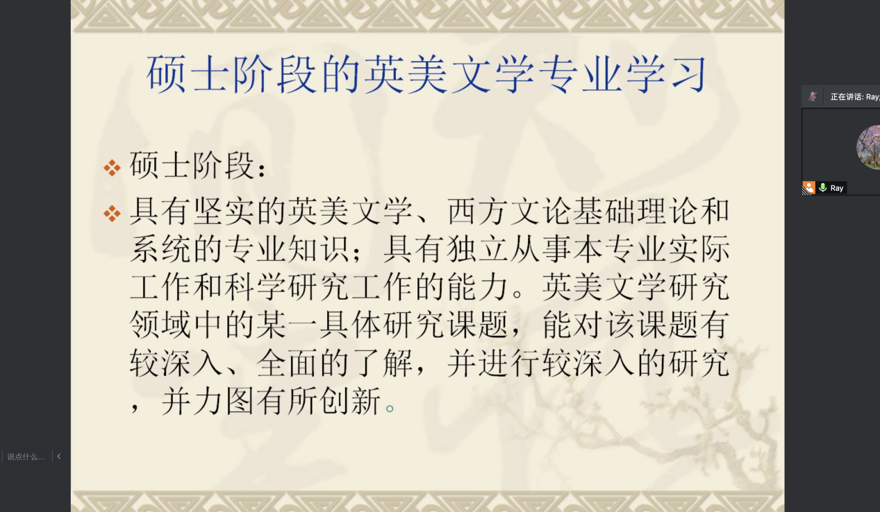 讲座分为五个部分,分别是英语专业及其内涵、硕士阶段的文学专业学习、考试科目及准备,专业深造与个人职业规划、2021级研究生经验分享。讲座伊始,芮老师介绍了英语专业的历史与内涵,分享了相关的文学专业研究生读研感想,使同学们对文学研究有了大致的认识。随后芮老师将硕士阶段的英美文学专业学习与本科阶段进行了对比,强调硕士阶段的研究更加深入与细化,围绕专题展开更具研究性。