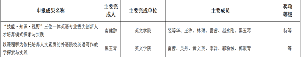 按照《关于开展2021年西安外国语大学高等教育教学成果奖评选暨2021年省级高等教育教学成果奖遴选推荐工作的通知》(西外发[2021]155号)要求,我院认真组织,教师积极申报,经专家组评审、校本科教学委员会审核、校内公示,获批两项校级高等教育教学成果奖,其中特等奖1项,一等奖1项。具体获奖信息如下: