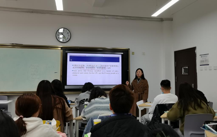 课堂以学生6分钟左右的小组展示为开始。学生结合《习近平谈治国理政》中的相关主题,用英语讲述中国在维护世界和平中的努力与贡献。随后,李林波老师对其中涉及到的视角、观点、术语做了点评。接下来是教学的展开。本堂课的教学以《习近平谈治国理政》第一至三卷中所选相关材料为基础,主讲教师首先引导学生认识重复性表达的分类及功能,然后以举例讲解如何分析文本中的重复性表达、理解其功能及效果,以及如何形成翻译思路。接下来,学生按照老师所讲授的方法,对所给句子进行译前分析、译中转换及译后修改与评估。最后,学生以小组为单位,就所给文本中的重复性表达及其翻译方法进行讨论,形成翻译思路,并参照官方译文进行了分析与总结和赏析。课堂最后,教师布置段落翻译练习,巩固学生对该语言现象的认识及对翻译方法的掌握。