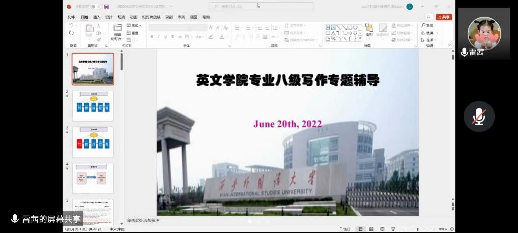 6月20日,雷茜老师进行了“专八写作辅导”讲座。雷老师从试题分析、测试能力、评分标准、应对策略、例文赏析五个方面对专八写作进行系统讲解。首先,雷老师通过试题改革前后题型的变化,指出专八写作学生需要具备的五大测试能力。其次,雷老师针对观点清晰、结构合理、内容充实、需要准确四项评分标准,给学生提供了相应的应对策略。接着,雷老师通过例文赏析,帮助同学理解专八写作的结构,并掌握英文写作所需的技巧方法。最后,雷老师对本次讲座进行总结,加深了同学们对专八写作的认识与了解。