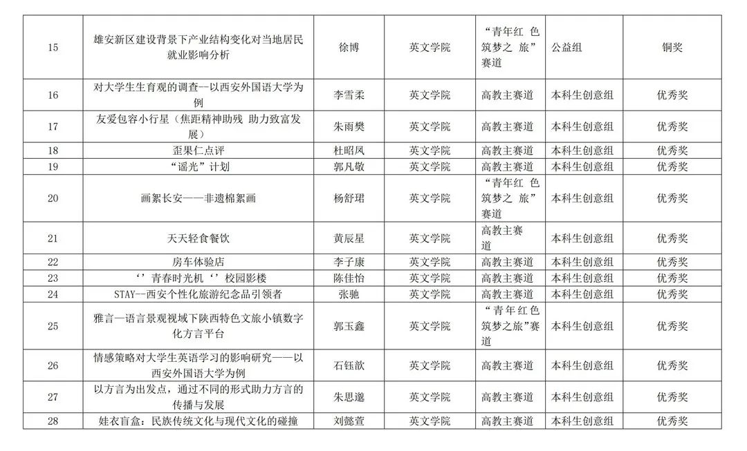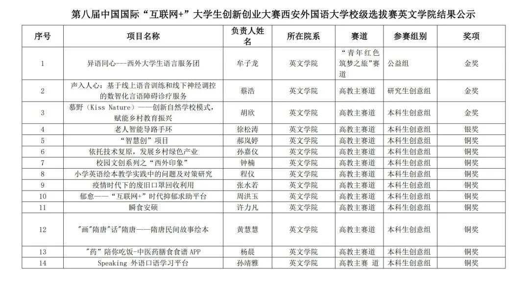 近日,学校下发《关于公布第八届 “互联网+”大学生创新创业大赛西安外国语大学校级选拔赛获奖结果的通知》,我院表现突出,共有28项(金奖3项,银奖1项,铜奖11项,优秀奖13项)。