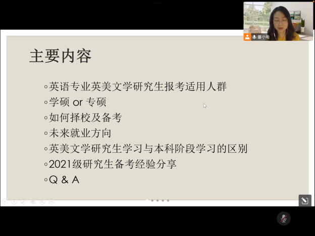 2022年11月23日,我院顺利举行文学方向的英语专业考研答疑讲座,邀请我院董小希老师担任主讲人。讲座中,董老师还邀请了两名往届优秀学姐何韶婷、周杰进行考研经验分享。