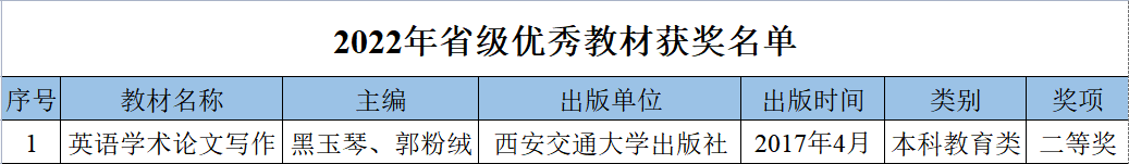黑玉琴教授、郭粉绒副教授主编的《英语学术论文写作》荣获省级优秀教材二等奖