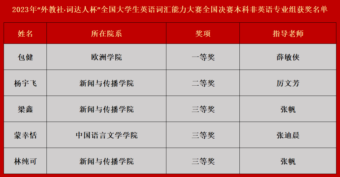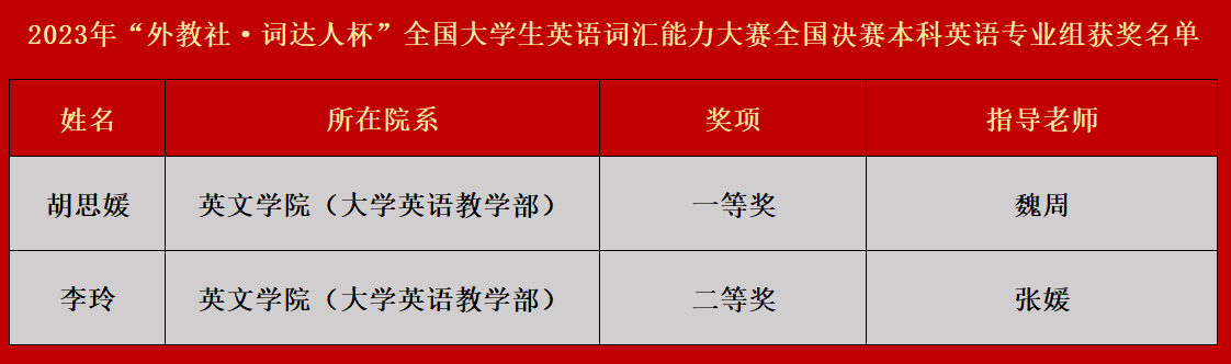 本次“外教社·词达人杯”全国大学生英语词汇能力大赛旨在推动大学生英语词汇学习,促进学生英语词汇能力发展,全方位综合提高大学生英语水平与能力。同时,大赛融入了思政英语词汇,充分体现了英语词汇学习中价值引导的理念。今后,我校将继续落实“以赛促练、以赛促学、以赛促教”的教学指导思想,深化英语教学改革,进一步提高学生对于英语学习的热情和兴趣,全面提升学生的综合能力,争取获得更优异的成绩。