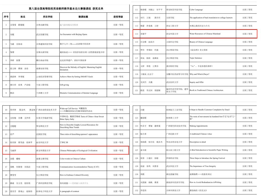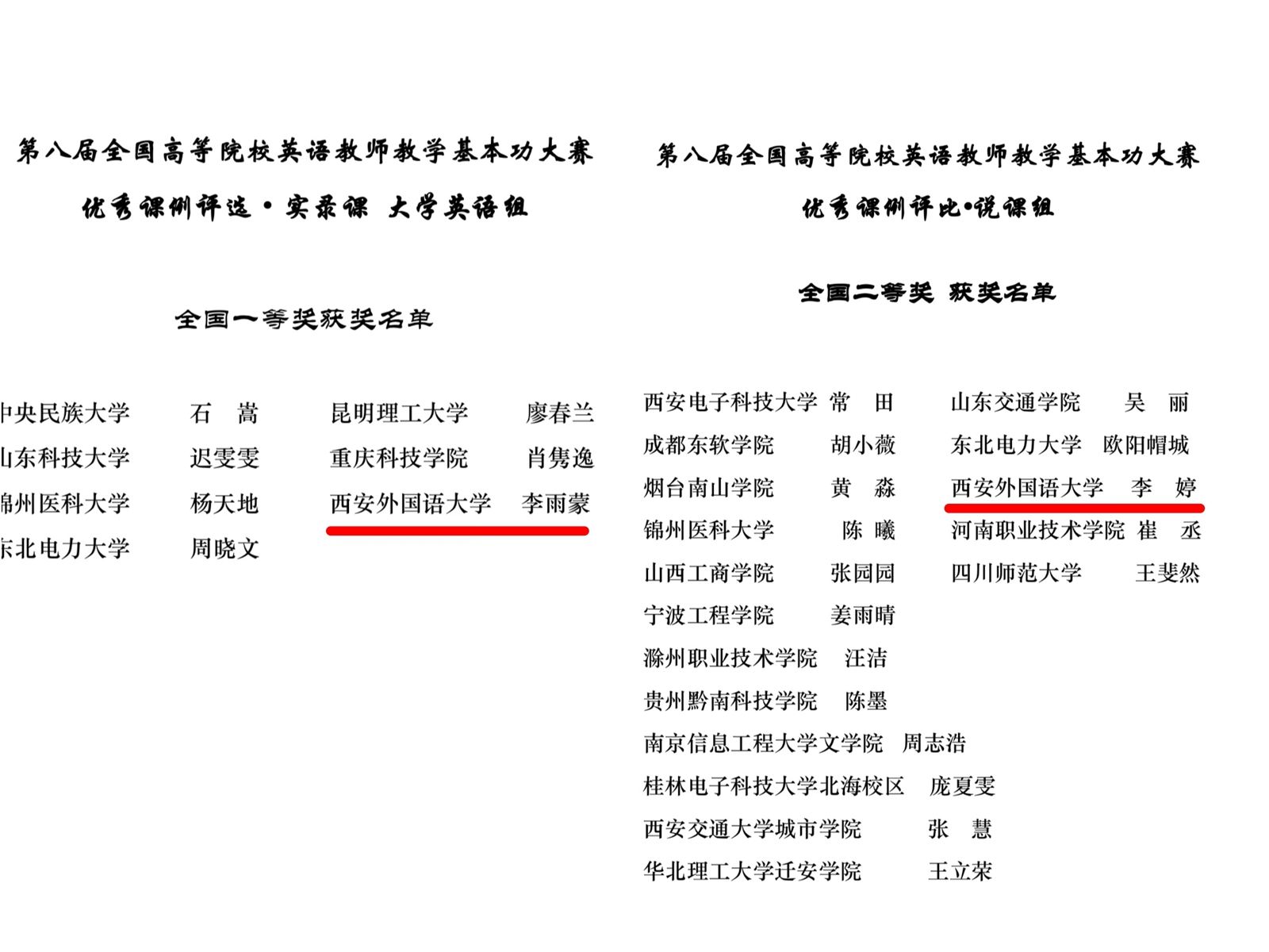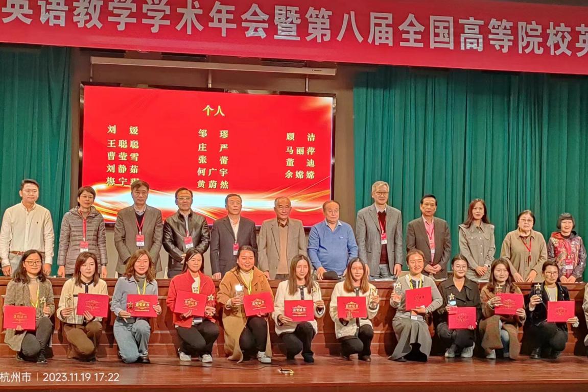 近日,由高等学校大学外语教学研究会、全国高等师范院校外语教学与研究协作组联合举办的第八届全国高等院校英语教师教学基本功大赛决赛圆满落幕,我院李雨蒙老师获实录课大学英语组全国一等奖省级一等奖,李婷老师获说课组全国二等奖和省级一等奖,马丽萍获微课组全国一等奖,苏锑平老师获微课组全国三等奖。