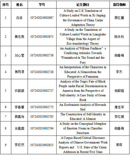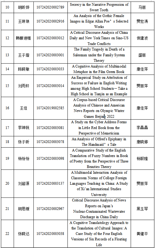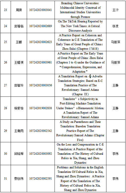 按照《西安外国语大学本科优秀毕业论文(设计)管理办法(试行)》(西外大教通[2017]10号)有关规定,经学院推荐、学校本科教学工作委员会委员审议、全校公示,我院共有25位教师指导的34篇本科毕业论文获2024届本科优秀毕业论文(设计)表彰,获表彰名单如下: