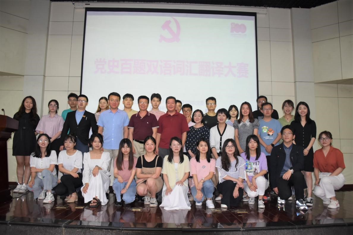 学党史、知党恩、颂党情、跟党走,为隆重庆祝中国共产党成立100周年,重温党的光辉历程,激发广大师生的爱党爱国情怀,作为党史学习教育的重要内容,学院结合专业特色,以赛促学,以学促干,6月15日晚在行政楼报告厅开展了学党史“六个一百”系列活动之党史百题双语词汇翻译大赛。院党委书记单升军、党委副书记马文静、副院长赵永刚出席大赛。大赛邀请翻译教研室王满良老师,刘晓梅老师以及孟利老师担任评委,各年级辅导员担任嘉宾。