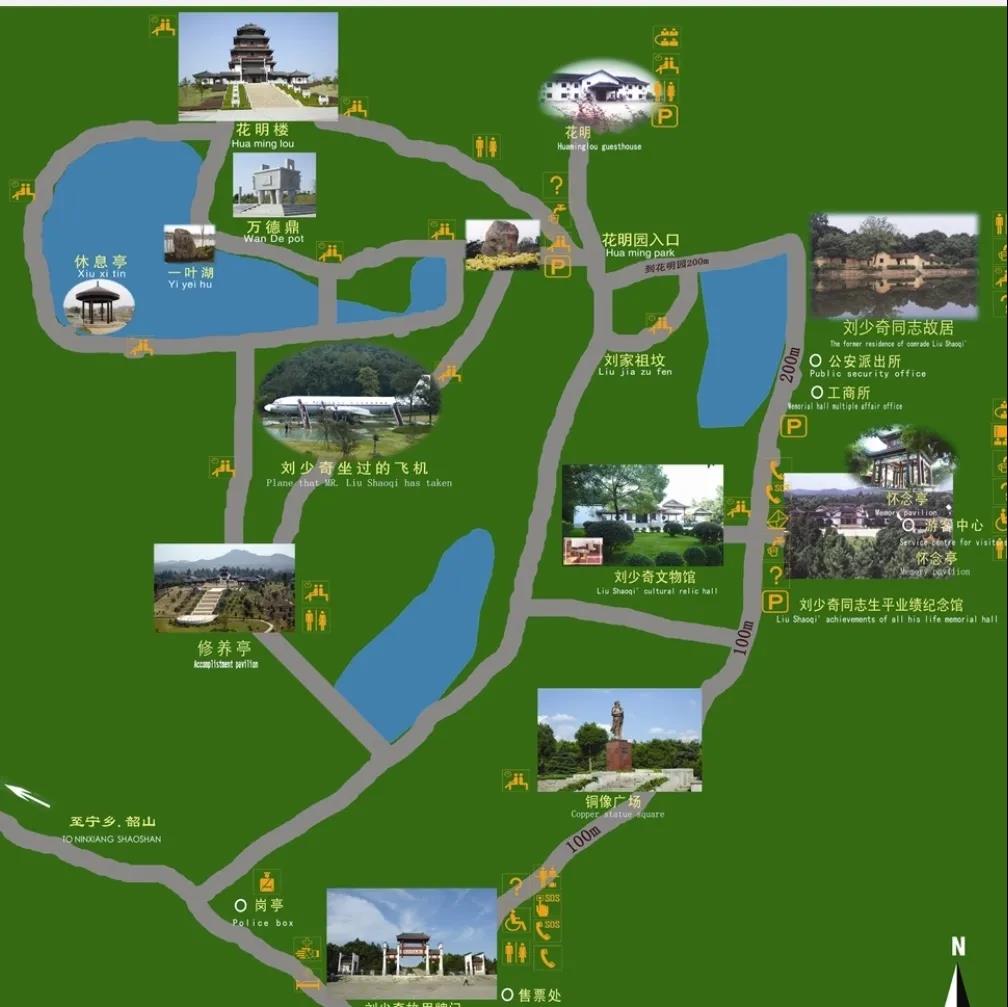 馆区占地面积1300亩,主要包括以重点文物保护单位刘少奇同志故居、门楼广场、铜像广场、生平业绩陈列馆、文物馆为主体的纪念场馆。该馆于1984年筹建,1988年开放。有 8个展室、1个声像厅和2个怀念亭,主体建筑3100平方米。纪念馆西南面的山地上,有高7.1米(基座高3.1米,铜像高4米)的刘少奇铜像。故居在纪念馆北面约250米的地方,是一栋半茅半瓦的土木结构农舍,为全国重点文物保护单位。