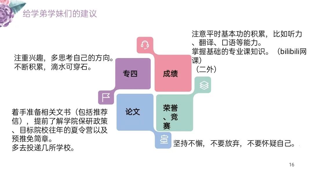 此次学院有幸邀请到保研至南京大学笔译专业的宋欣泽学姐、保研至北京航空航天大学外英语专业的徐婷婷学姐、陕西师范大学学科英语考研上岸的陈晓楠学姐和上海外国语大学口译专业考研上岸的王子瑞学姐为大家分享她们的保研和考研经验。