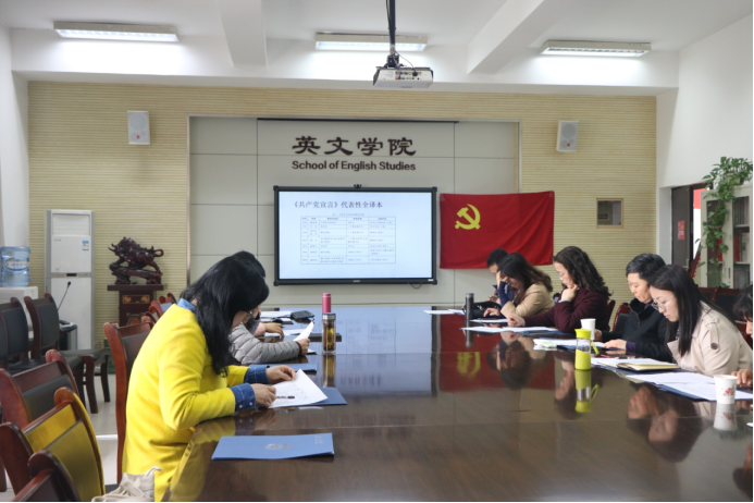 “A specter is haunting Europe — the specter of communism.”“一个幽灵,共产主义的幽灵,在欧洲游荡……”,4月7日下午,我院翻译党支部在会议室里,党员们以接力诵读的形式,开展了一场以“重温红色经典,感悟初心力量”为主题的汉英双语接力诵读《共产党宣言》主题党日活动。