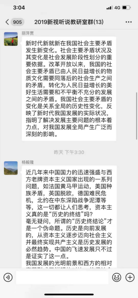 高英教研室(支部)在B420认真学习讨论了《习近平新时代中国特色社会主义思想学习问答》中的第7问。并在教研室主任董小希老师组织下集体研讨了教研室各项活动情况,并结合近期教学内容集思广益提炼思政元素,推进课程思政建设。